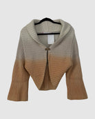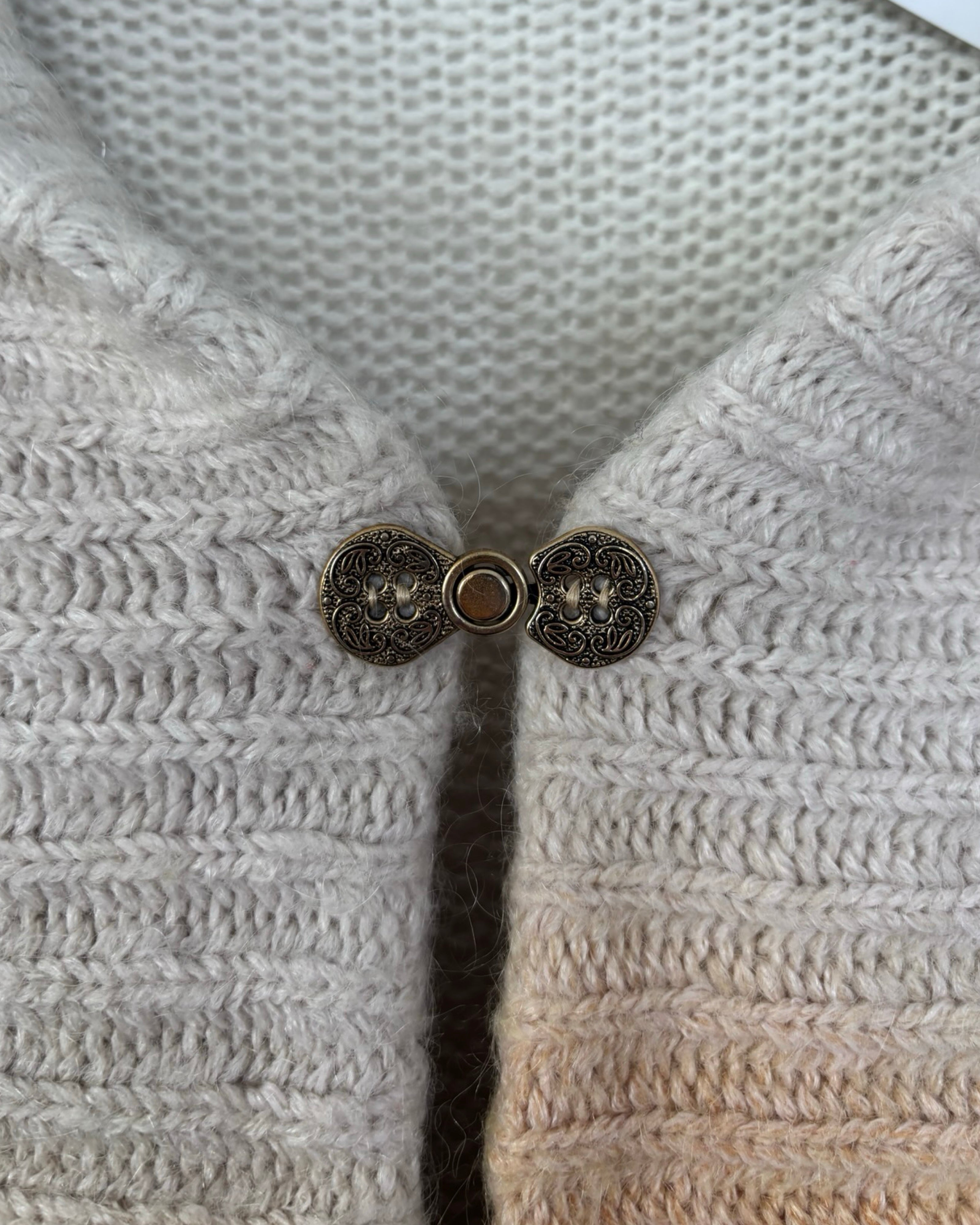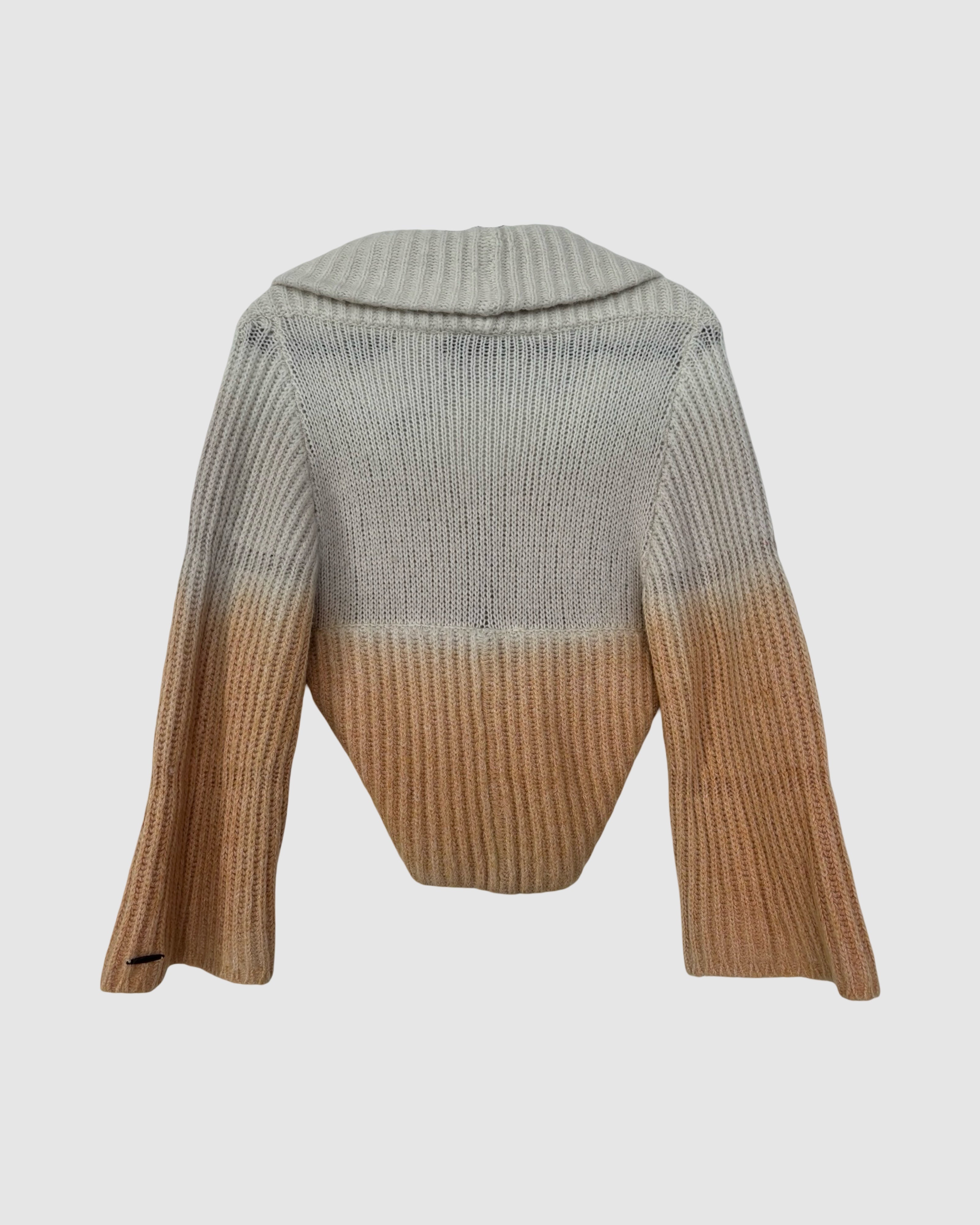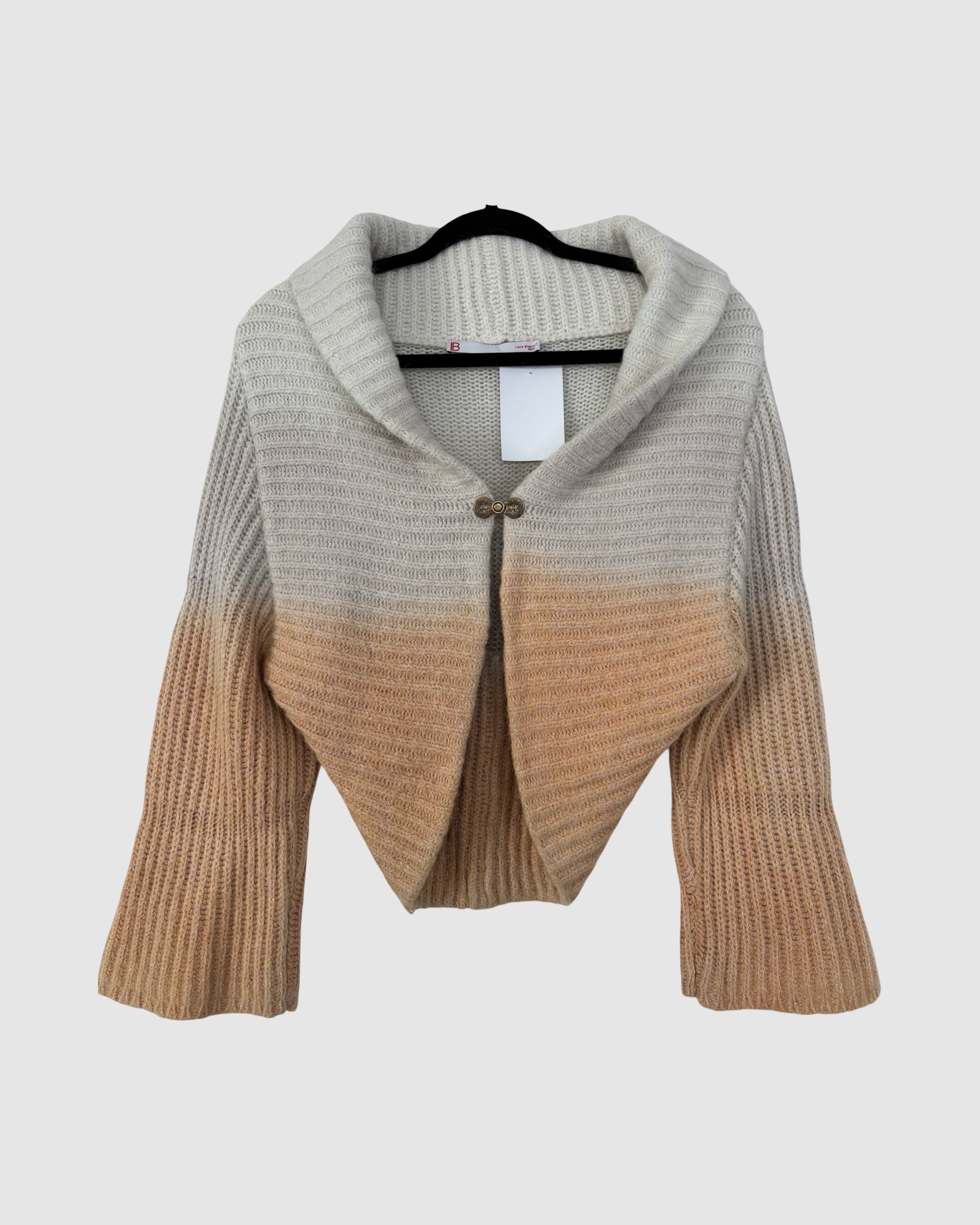 Discover timeless sophistication with this Laura Biagiotti cardigan, a luxurious blend of mohair, polyamide, and elastane crafted for refined elegance. The stunning ombre effect transitions seamlessly from soft off-white to warm peach-orange, creating a captivating visual journey. Flared sleeves add graceful movement, while the bronze and gold closure provides a sophisticated finishing touch. A versatile investment piece that effortlessly elevates any wardrobe with understated luxury and contemporary style.
