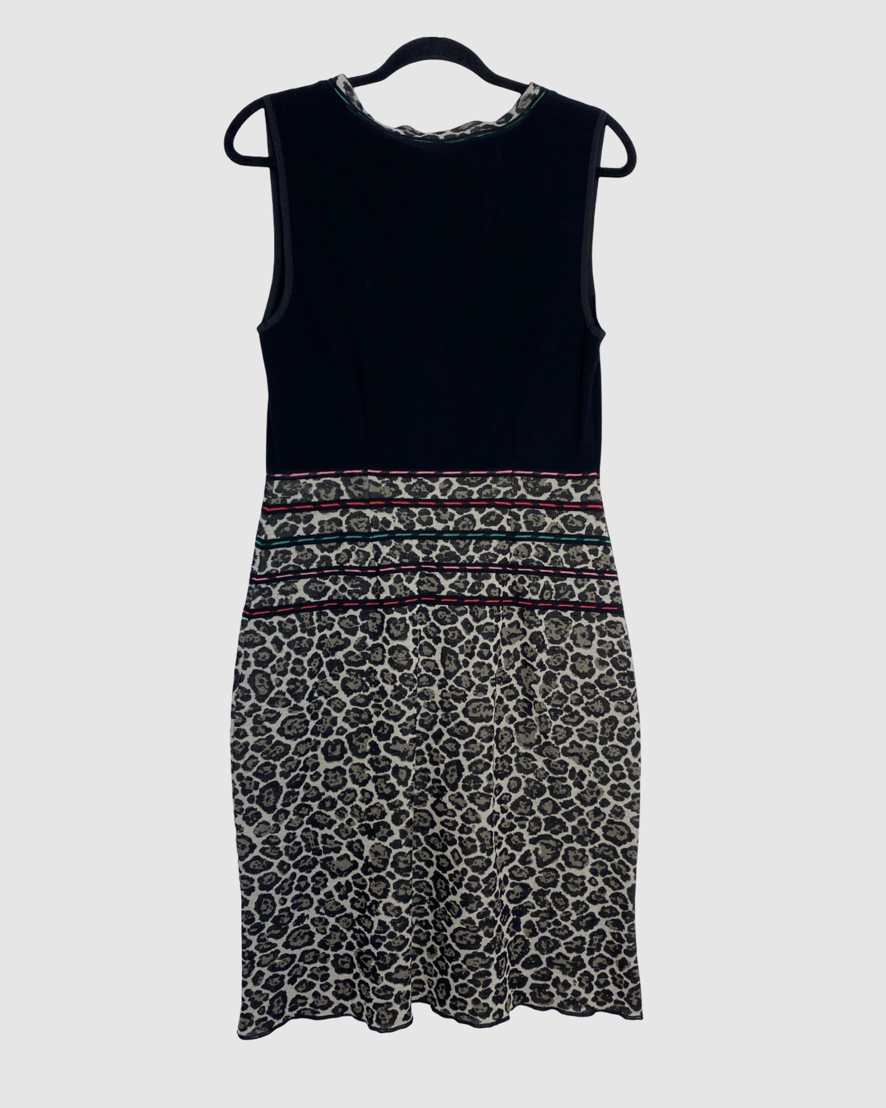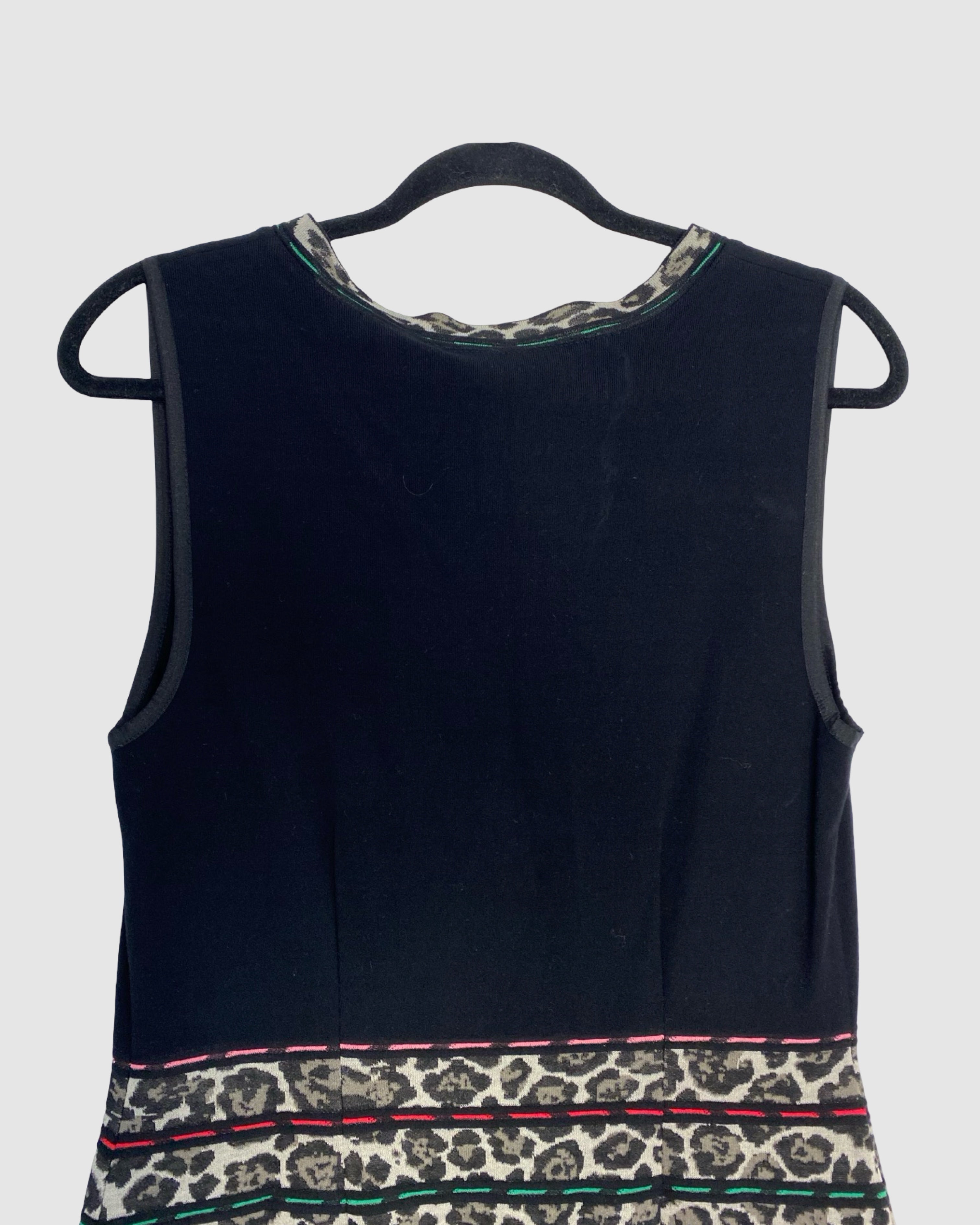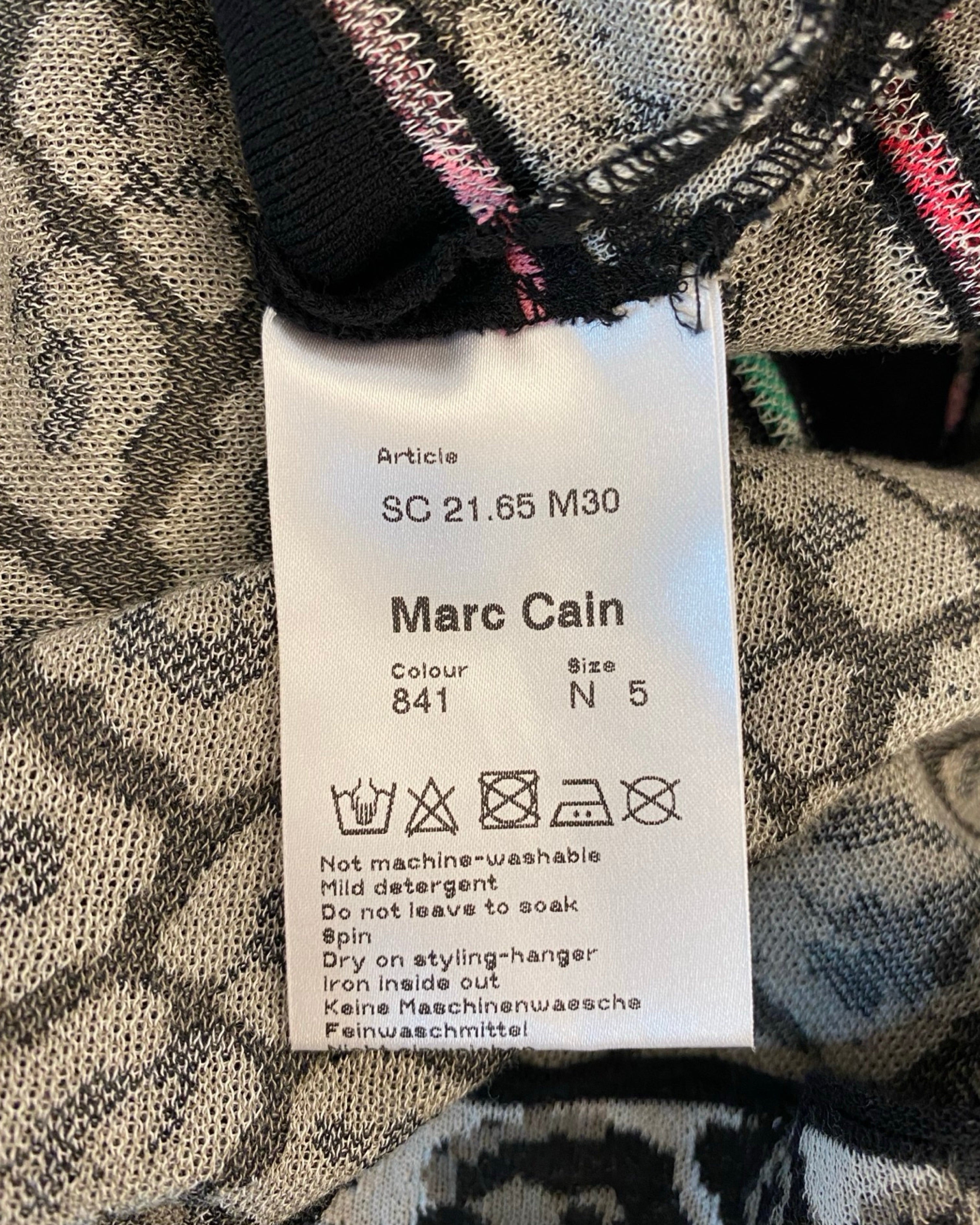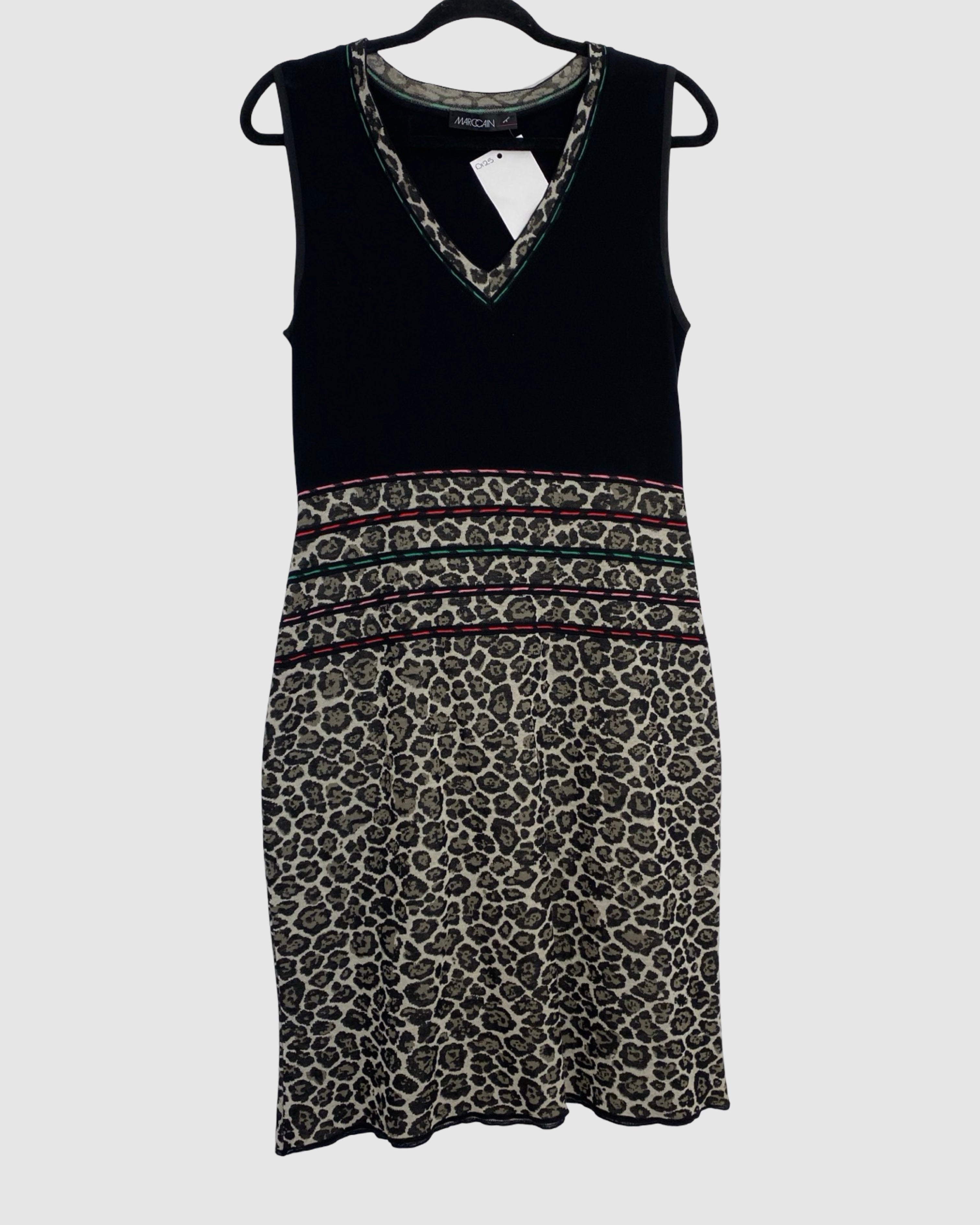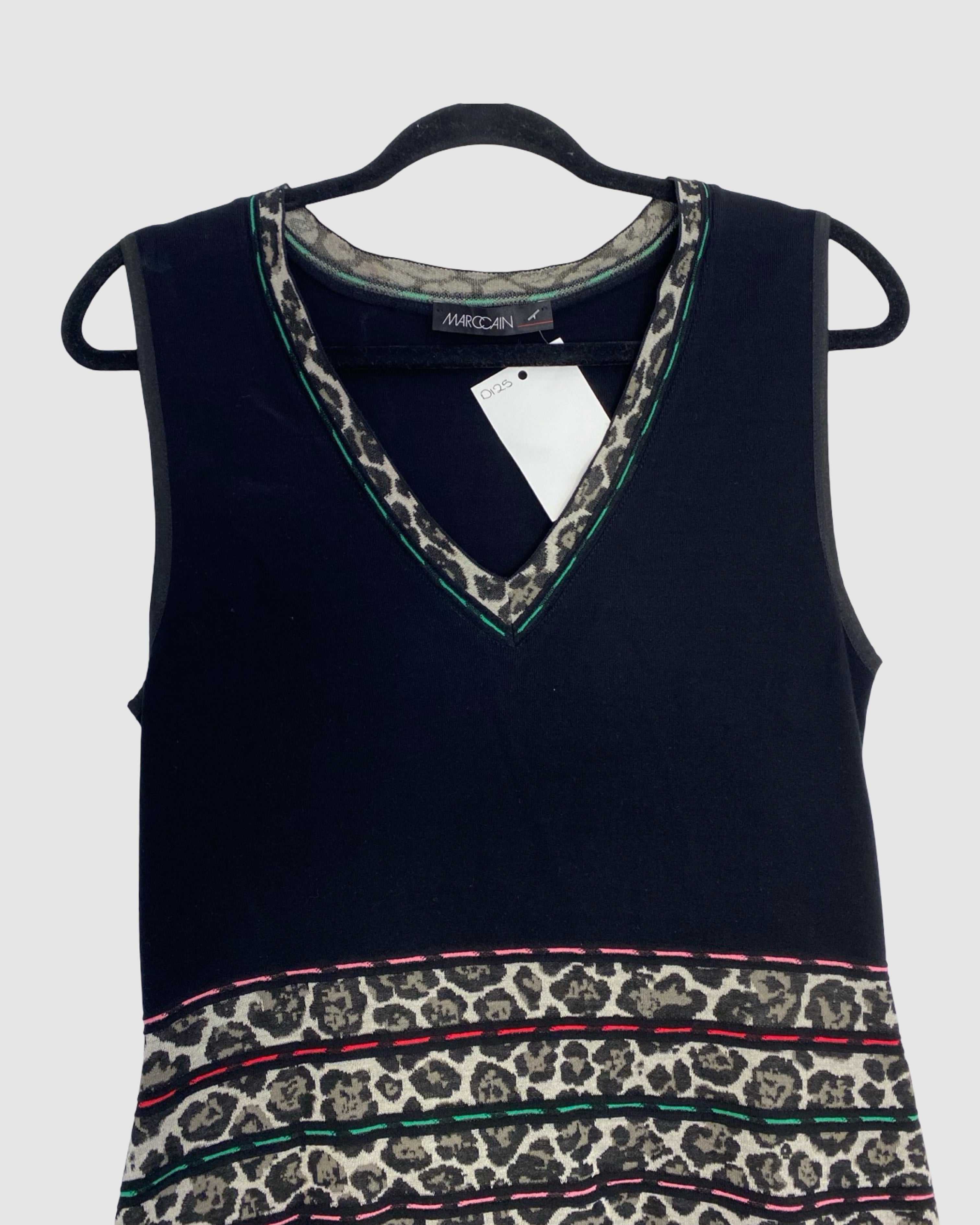 Bold and effortlessly chic, this Marc Cain black dress features a striking leopard print design with a flattering V-neckline and sleeveless cut. Crafted from a cotton and polyamide blend, it’s perfect for both daytime styling and evening occasions, combining modern elegance with a confident edge. Size: XL.