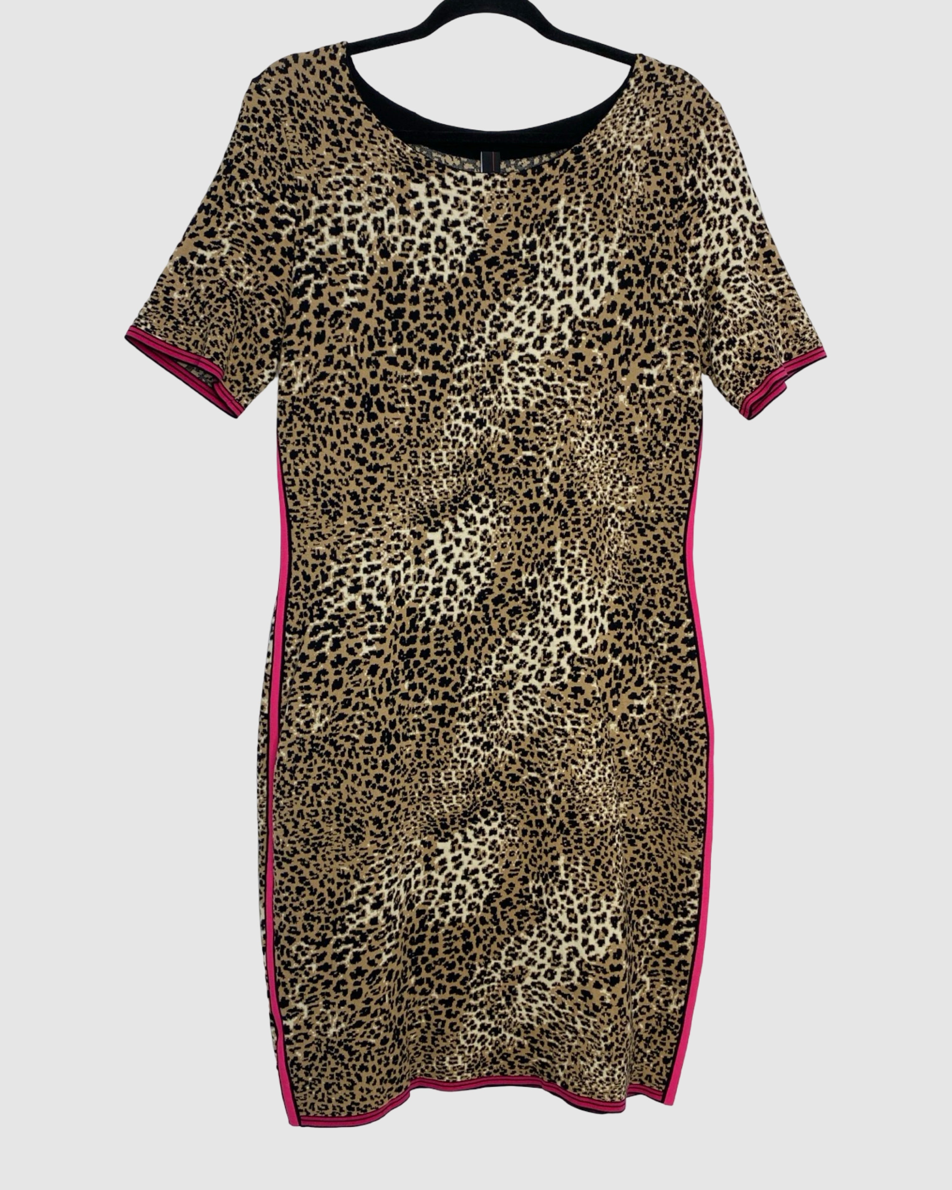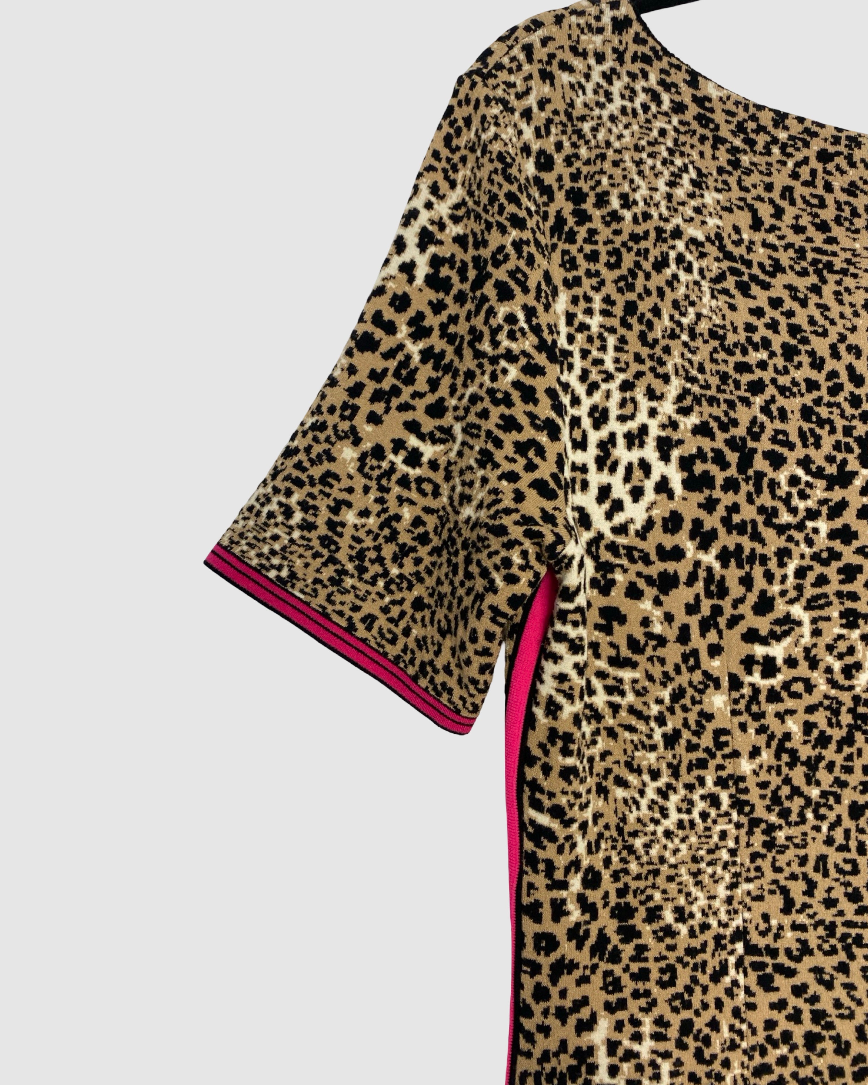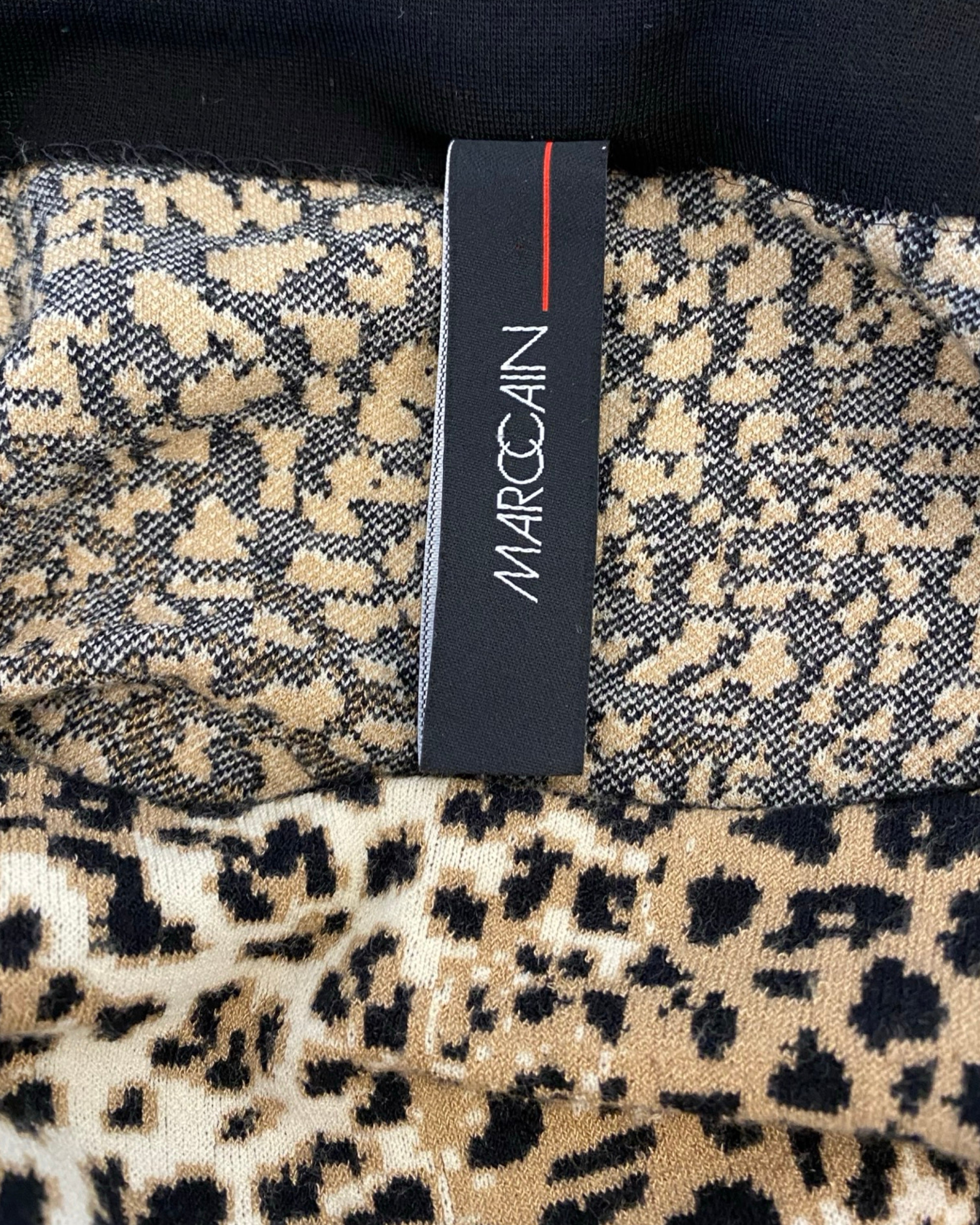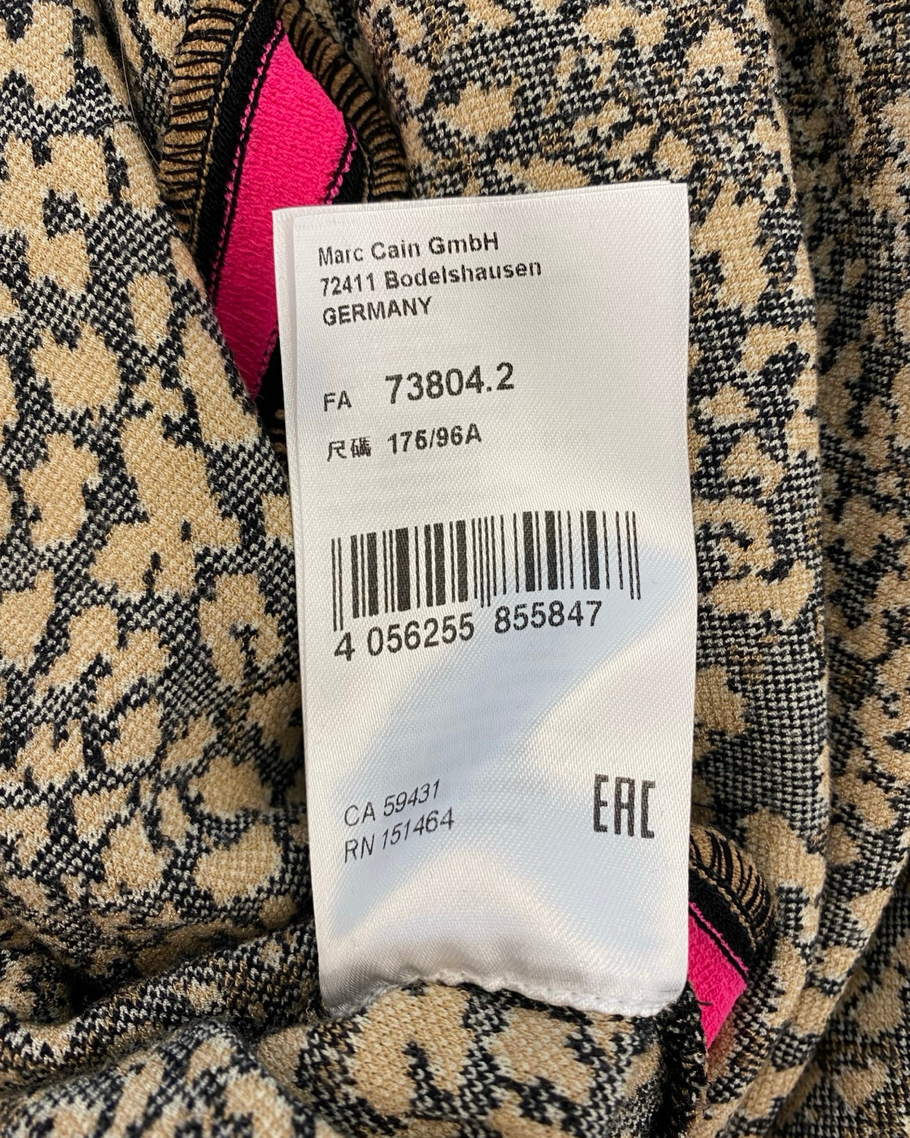 Chic and eye-catching, this Marc Cain dress features a playful leopard print with black and pink detailing and short sleeves for a modern, versatile silhouette. Crafted from a viscose and polyamide blend, it’s perfect for both casual and semi-formal occasions, blending contemporary style with a bold designer touch. Size: XL.