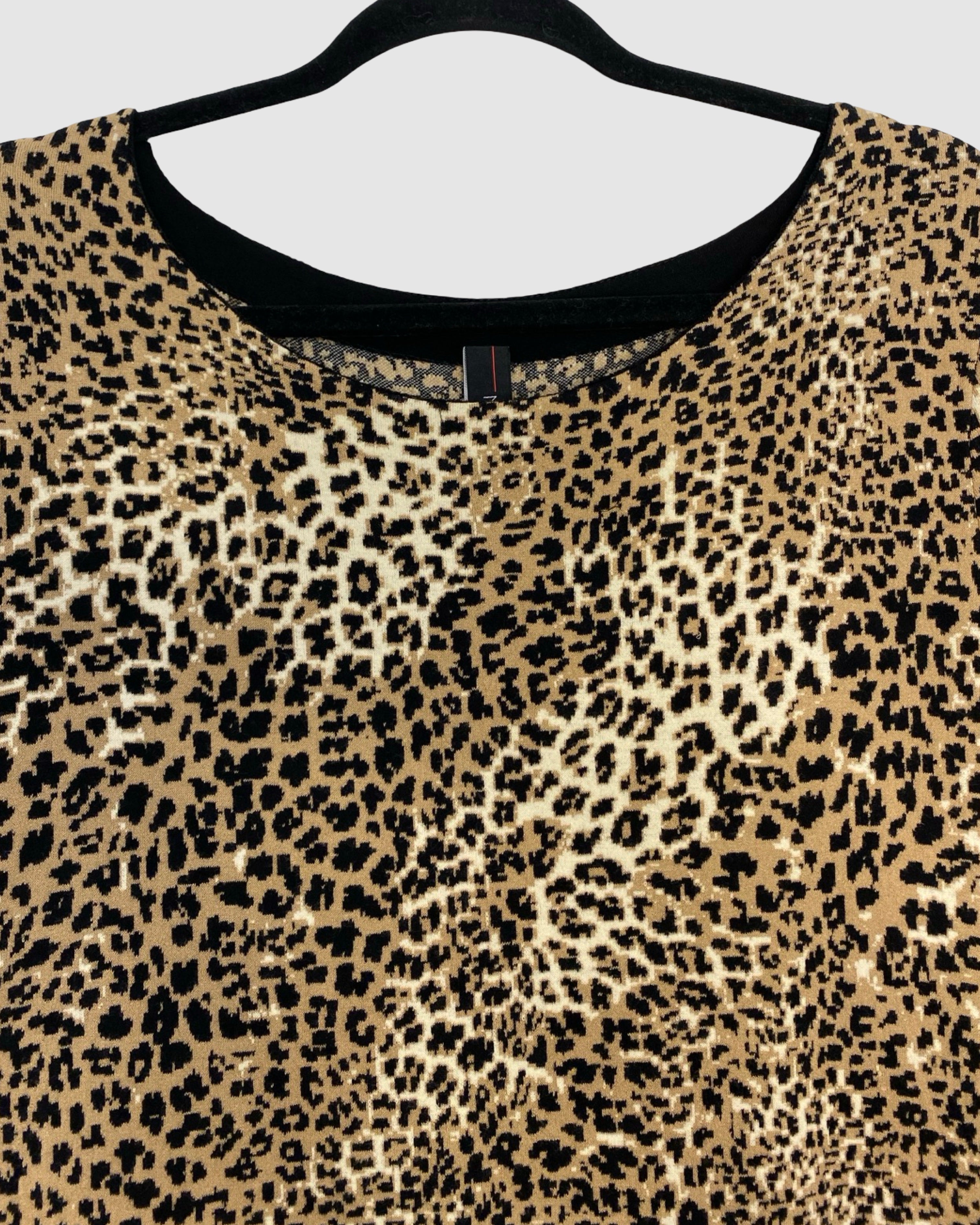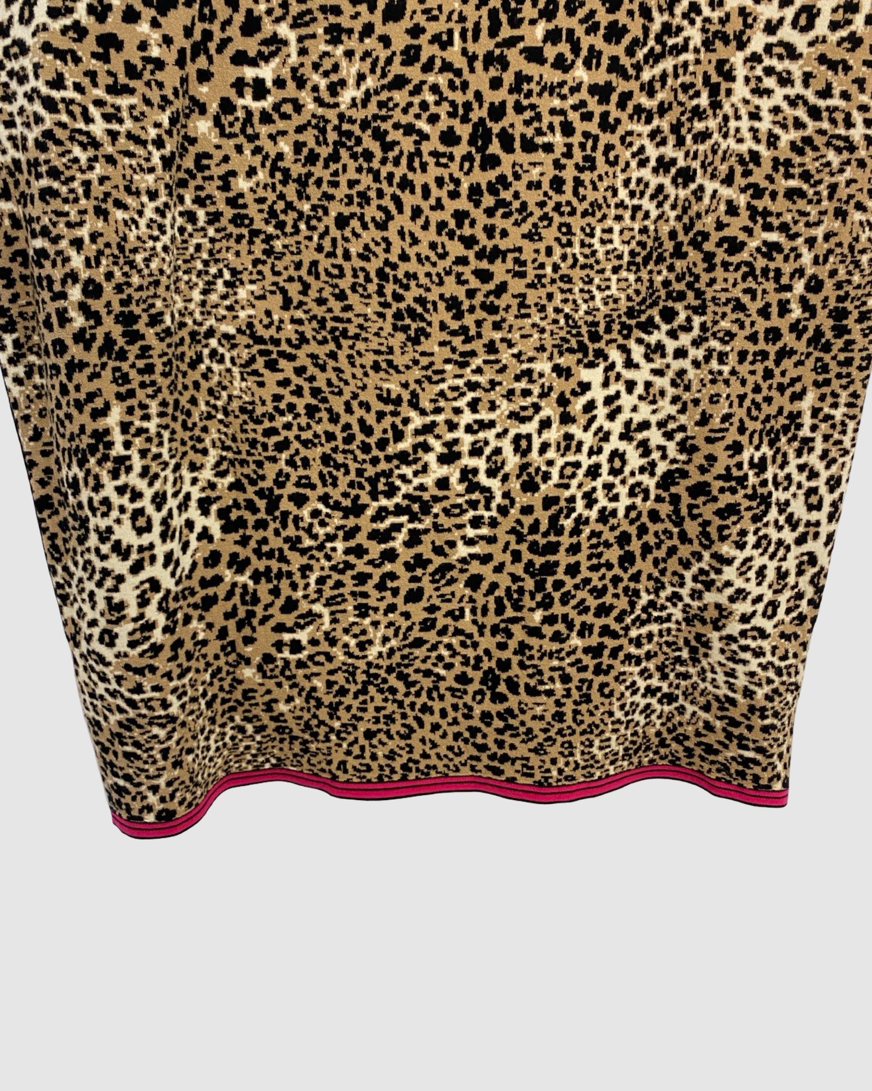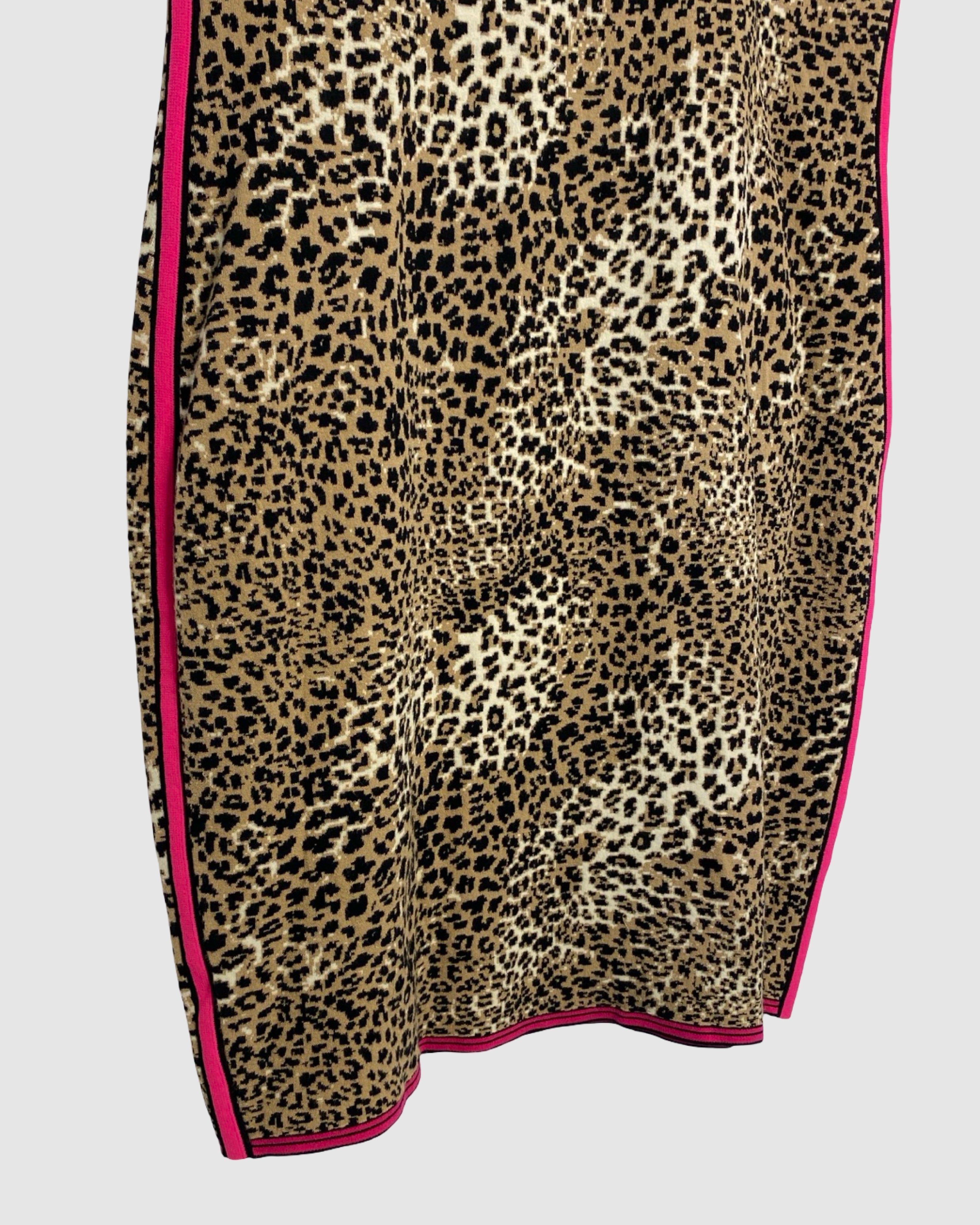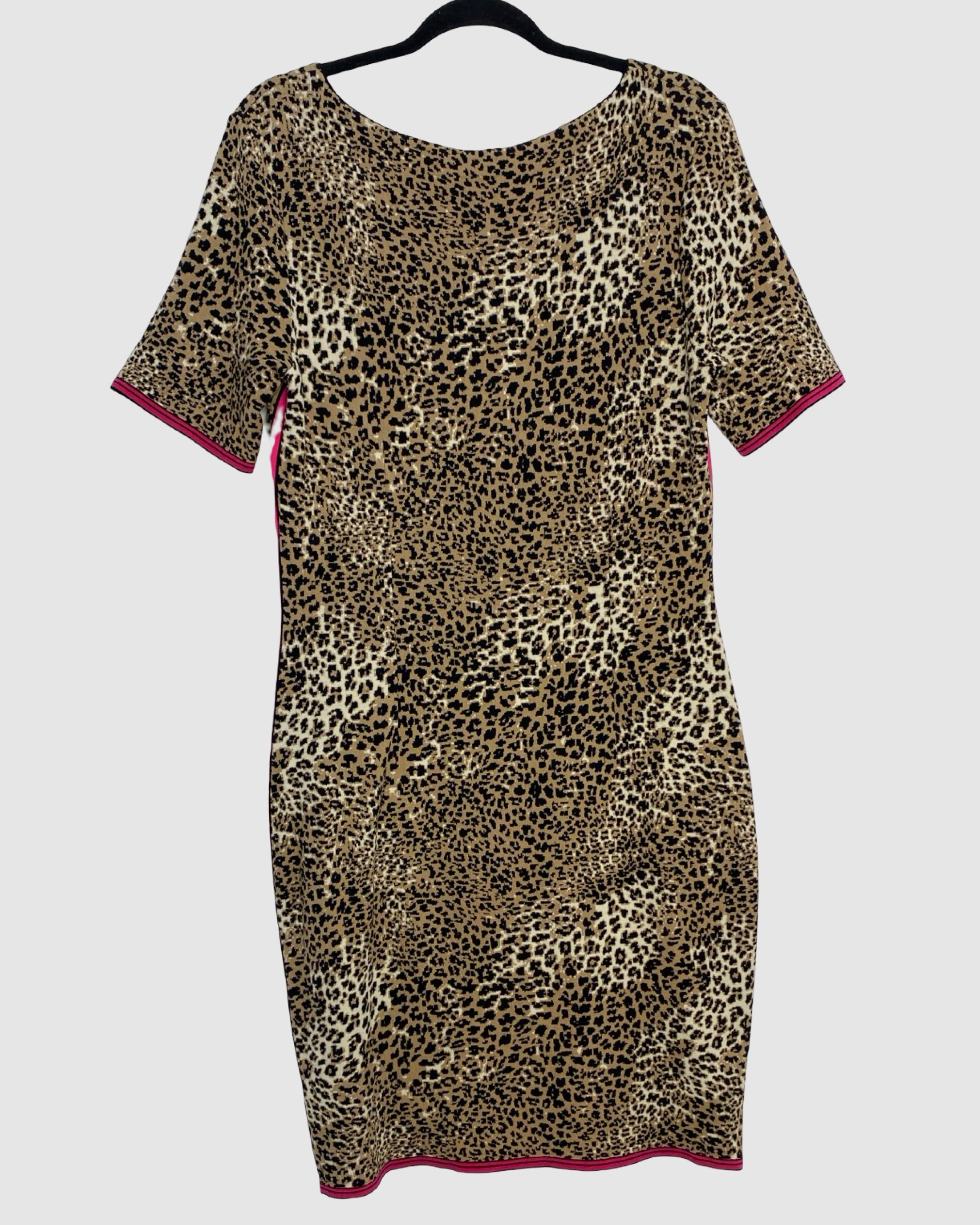 Chic and eye-catching, this Marc Cain dress features a playful leopard print with black and pink detailing and short sleeves for a modern, versatile silhouette. Crafted from a viscose and polyamide blend, it’s perfect for both casual and semi-formal occasions, blending contemporary style with a bold designer touch. Size: XL.