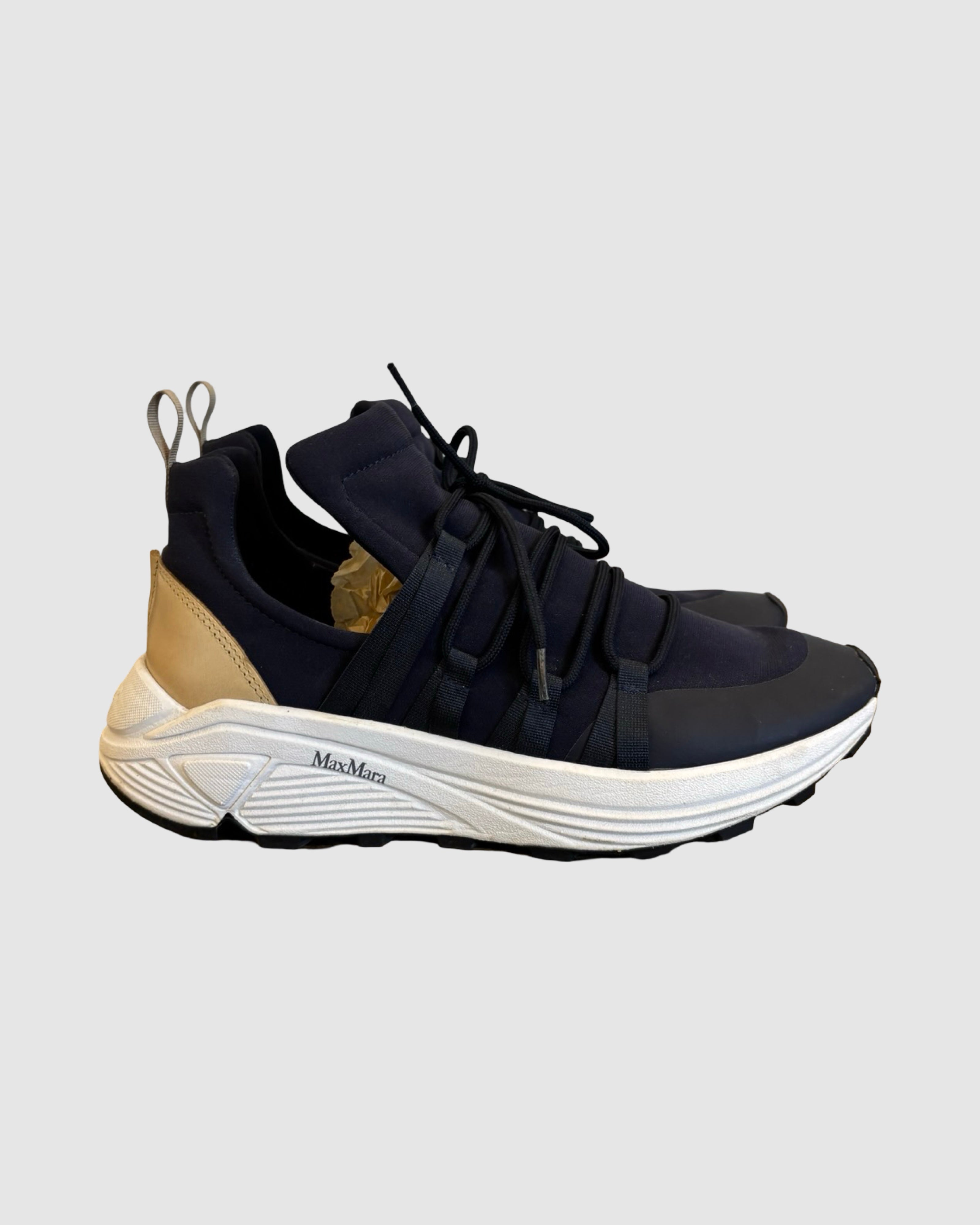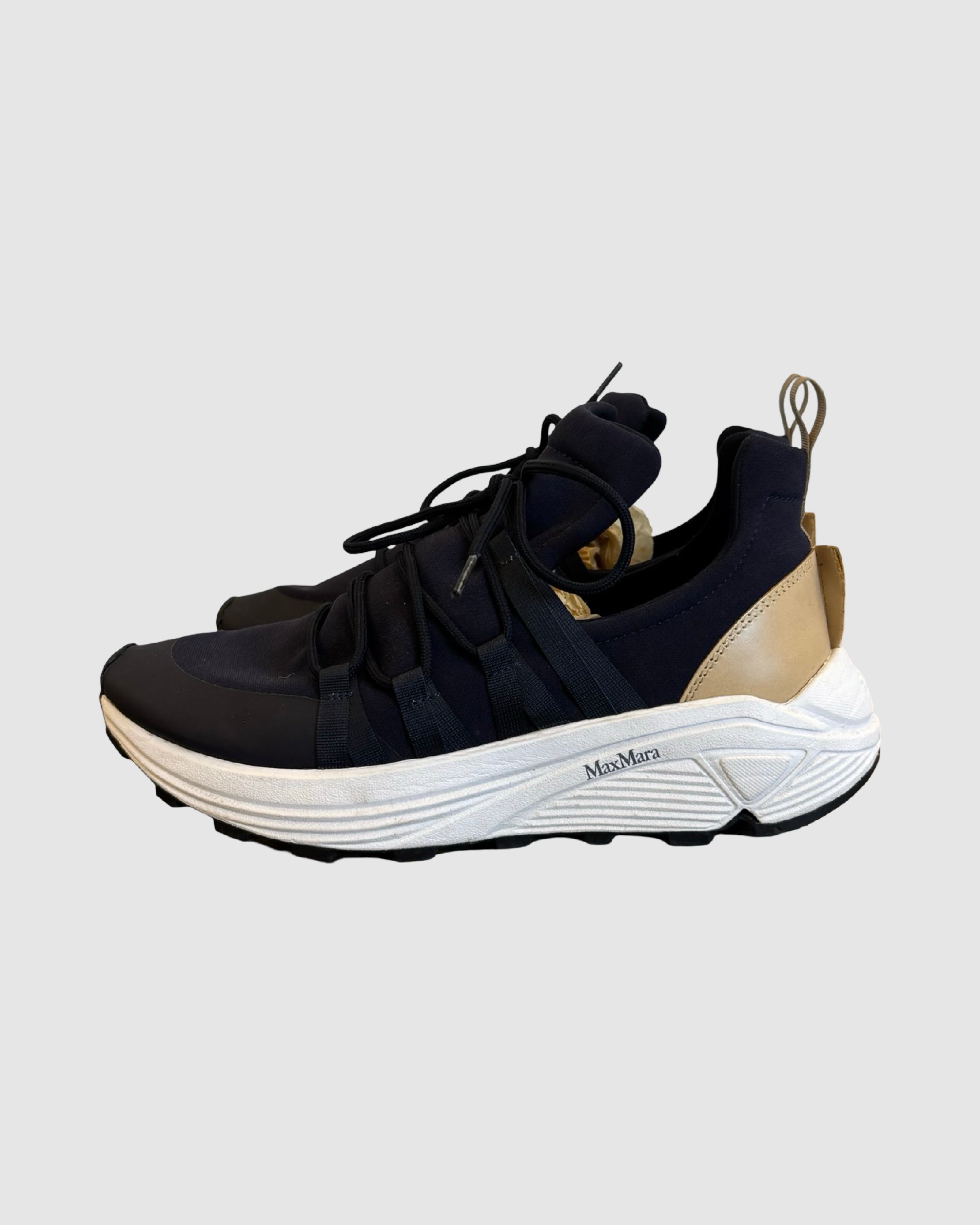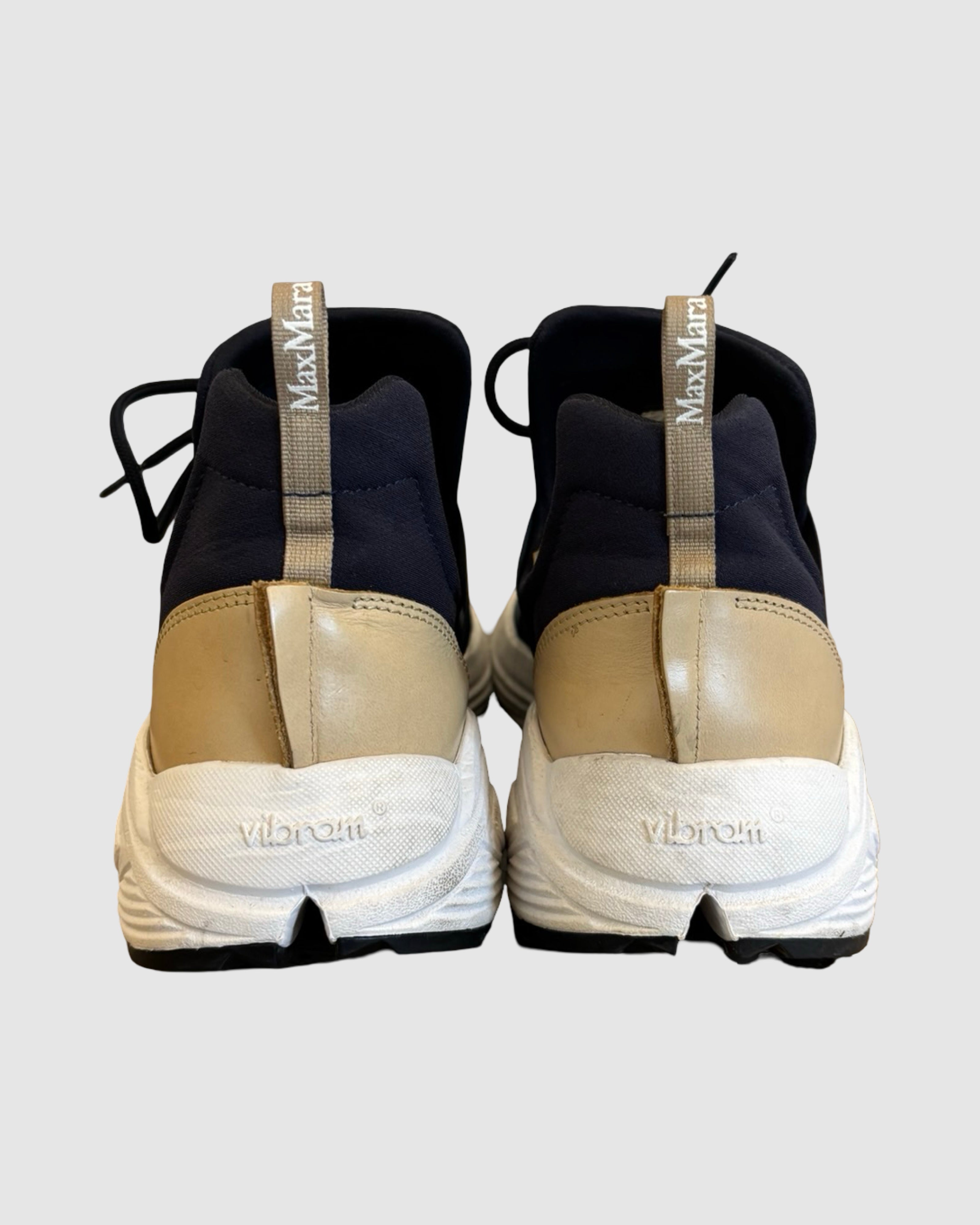 Max Mara Raissa sneakers in technical fabric and leather, designed for effortless everyday elegance. This versatile pair features a refined beige and black colorway with secure lace fastening, perfect for transitioning from casual to smart-casual occasions. Crafted with premium materials, these sporty sneakers deliver comfort without compromising on style.