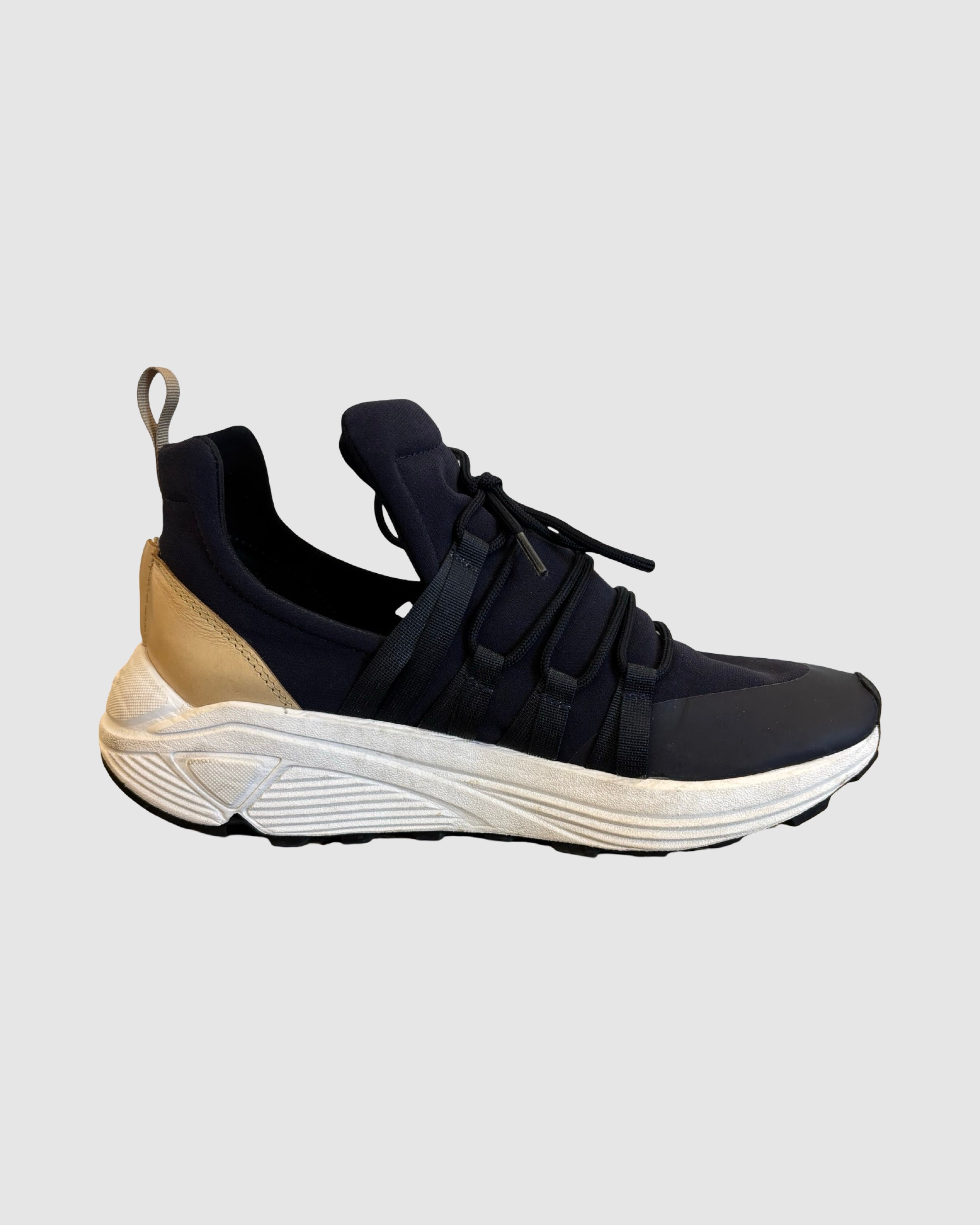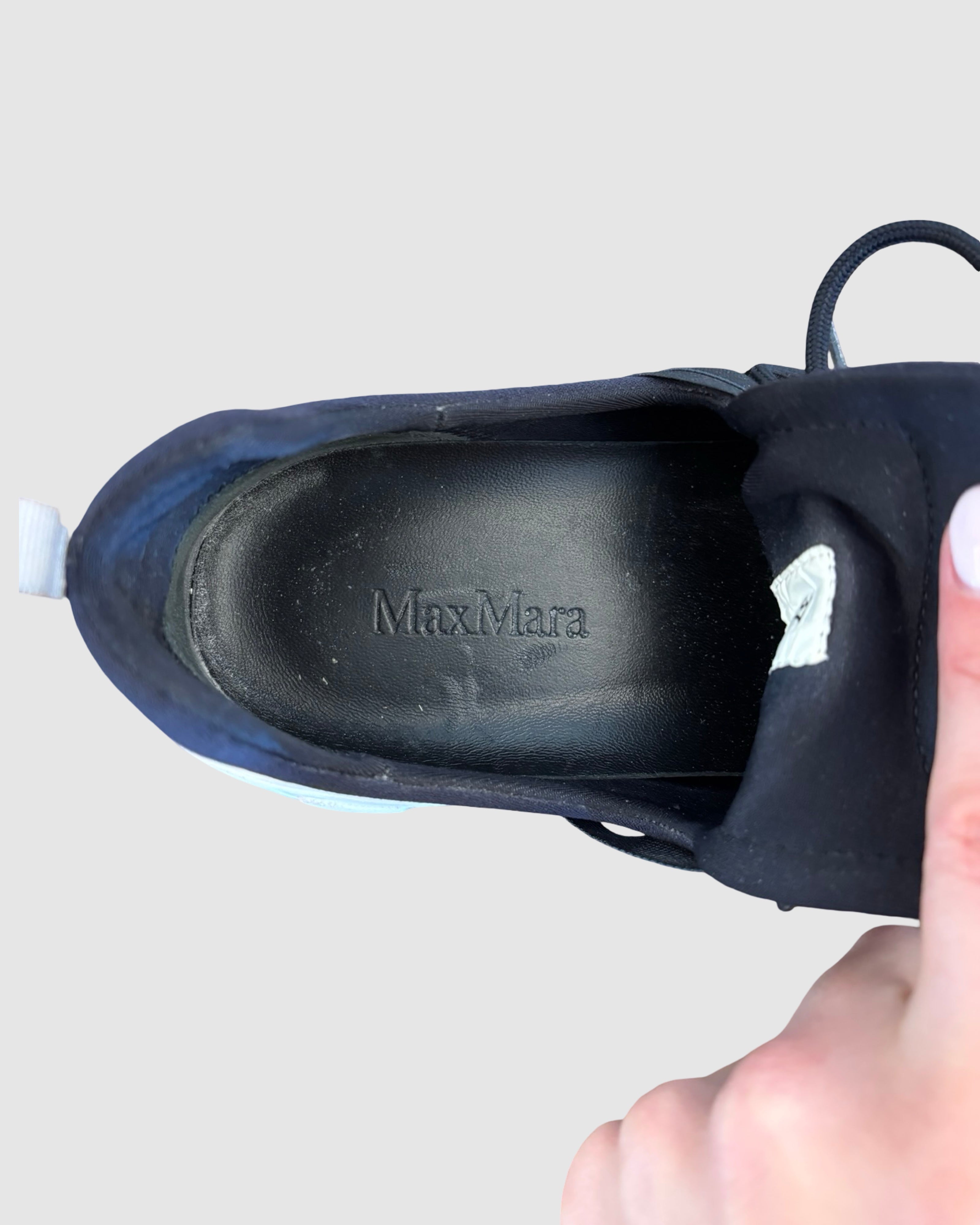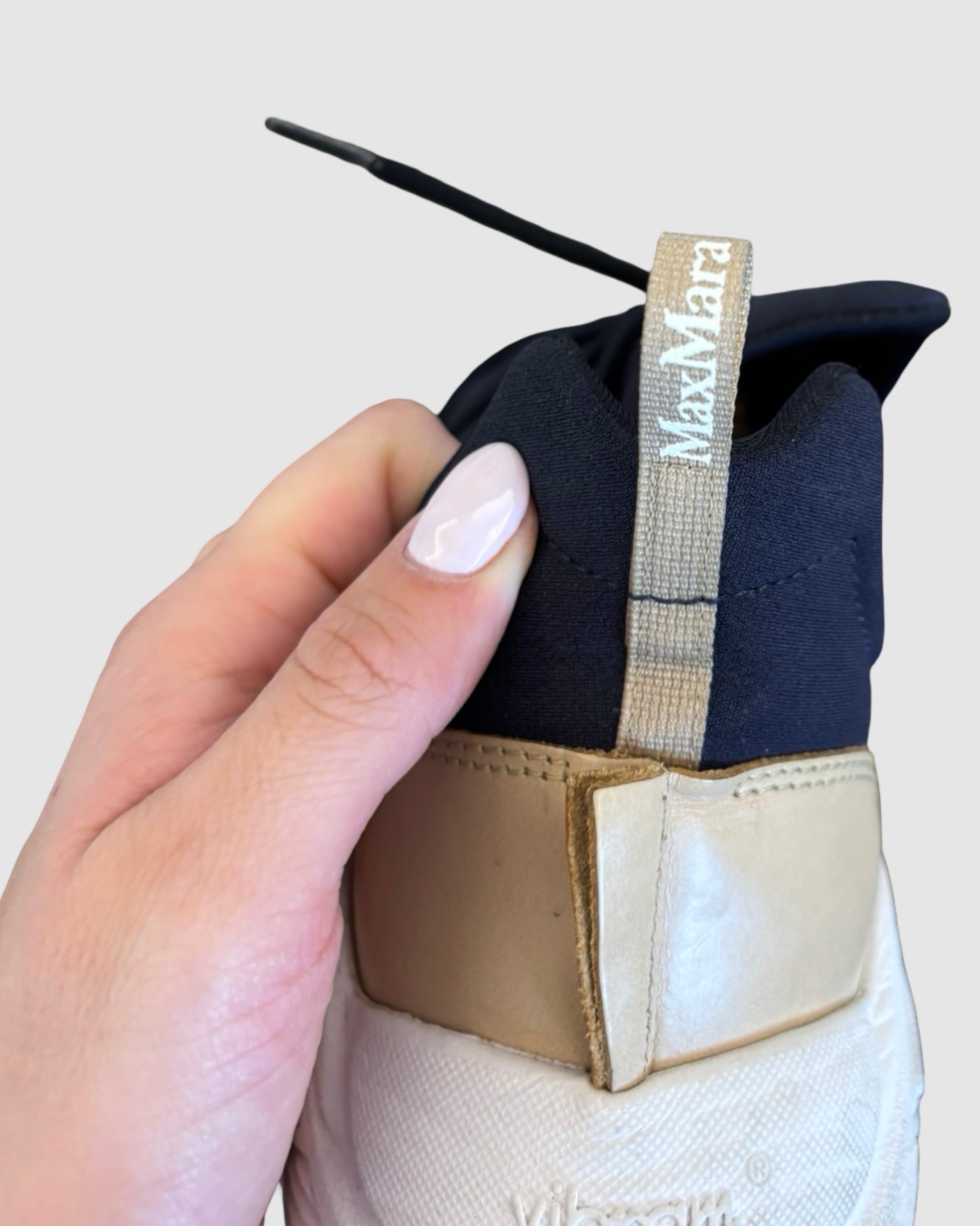 Max Mara Raissa sneakers in technical fabric and leather, designed for effortless everyday elegance. This versatile pair features a refined beige and black colorway with secure lace fastening, perfect for transitioning from casual to smart-casual occasions. Crafted with premium materials, these sporty sneakers deliver comfort without compromising on style.