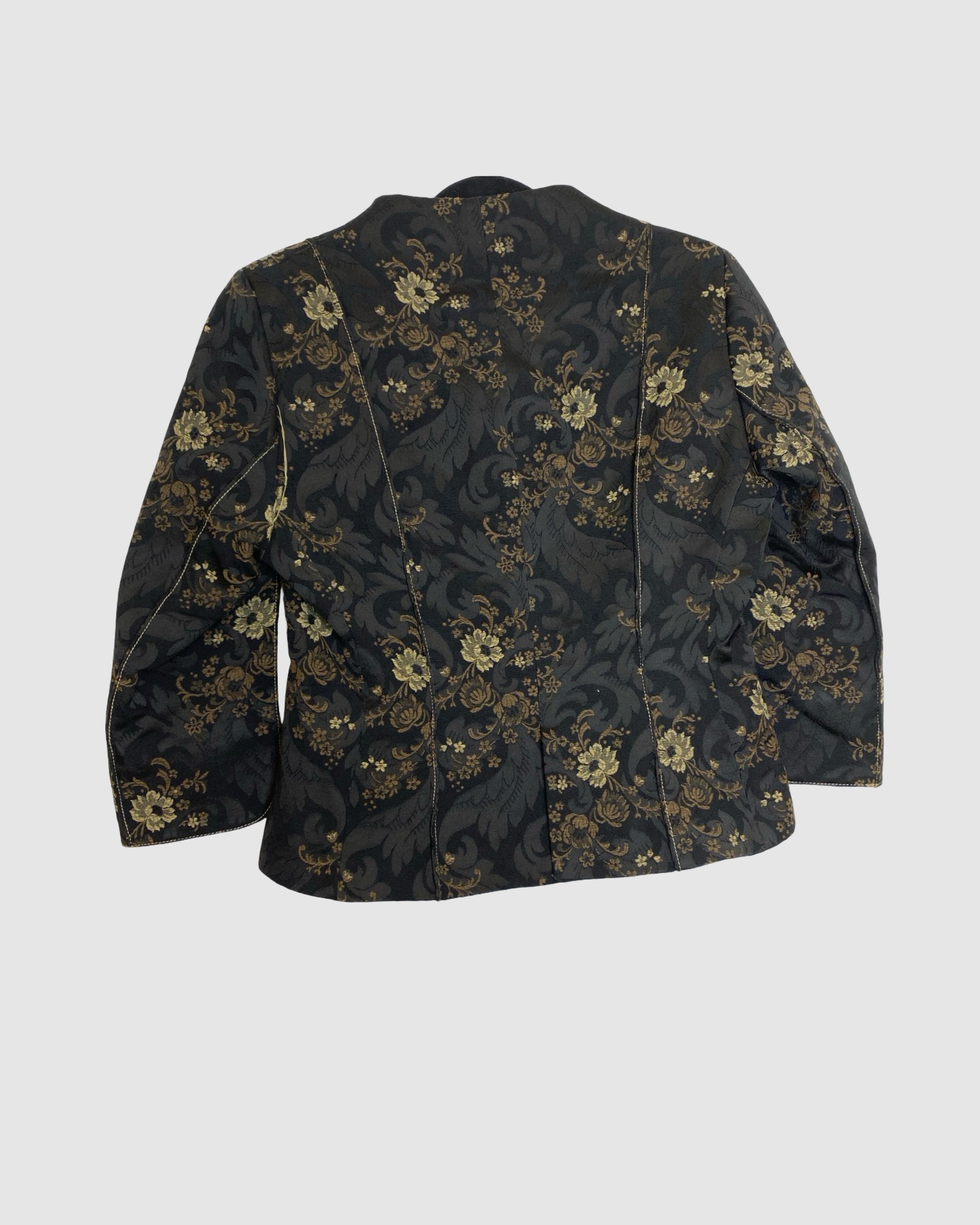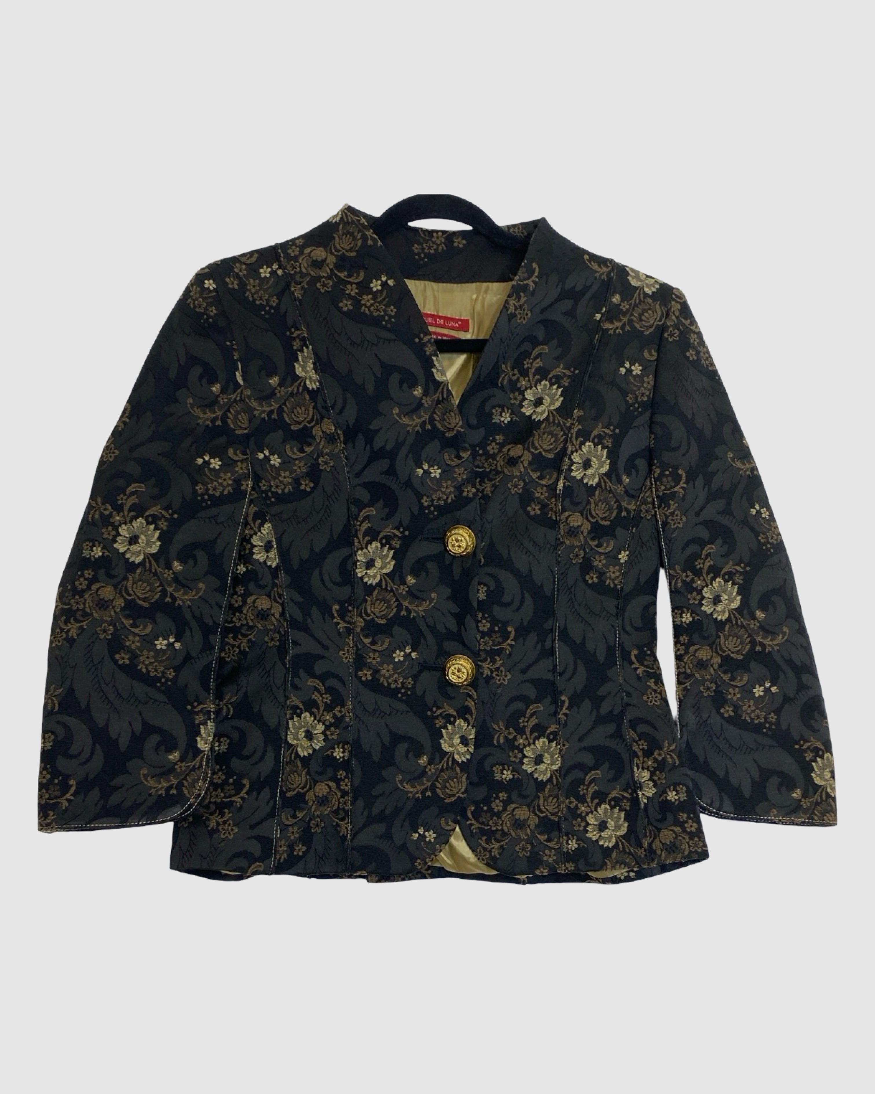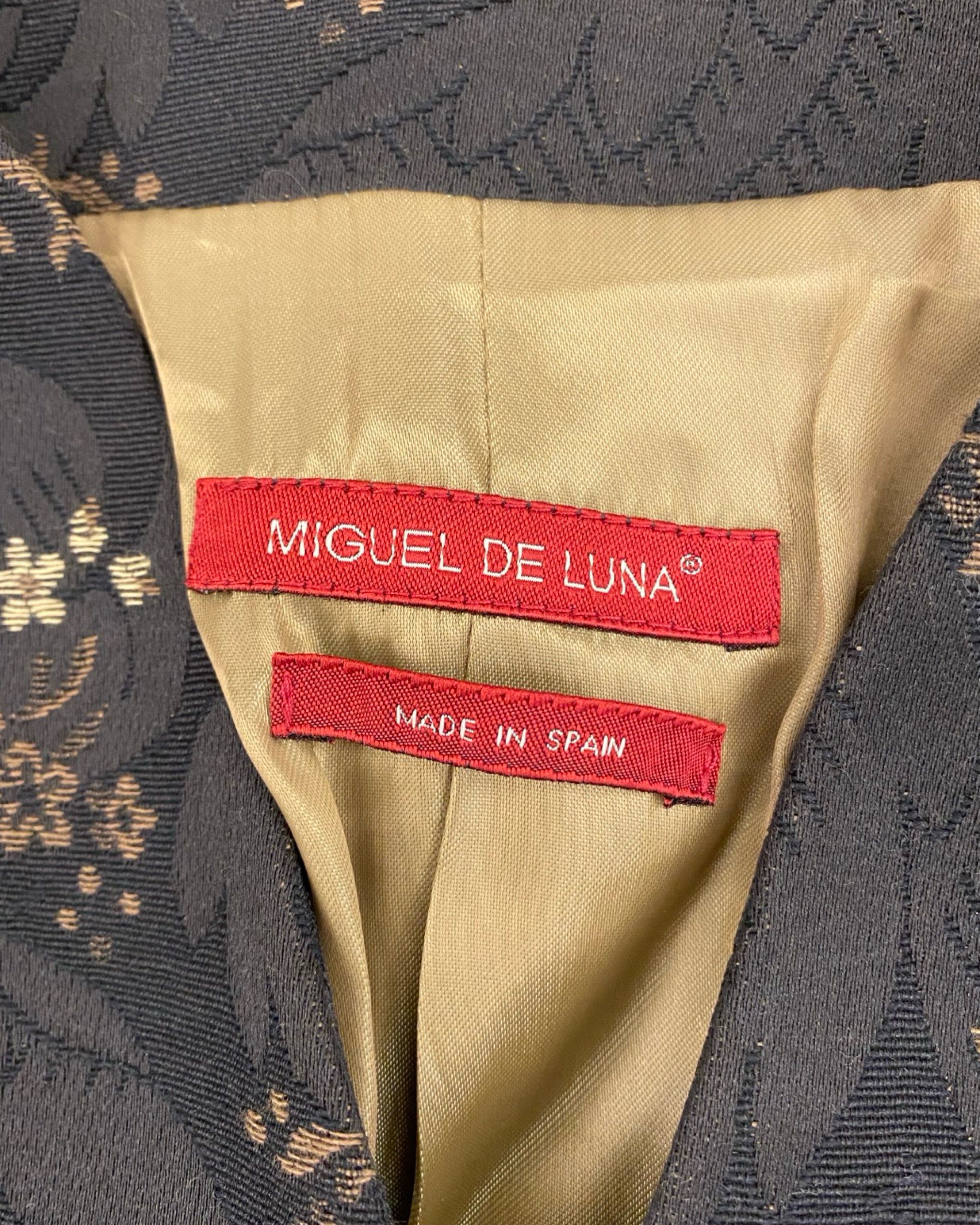 Elegant and eye-catching, this Miguel de Luna black blazer features intricate gold and beige floral detailing for a sophisticated, statement-making look. Crafted from a cotton and polyester blend, it’s perfect for elevating both professional and evening outfits with a touch of designer flair. Size: L.