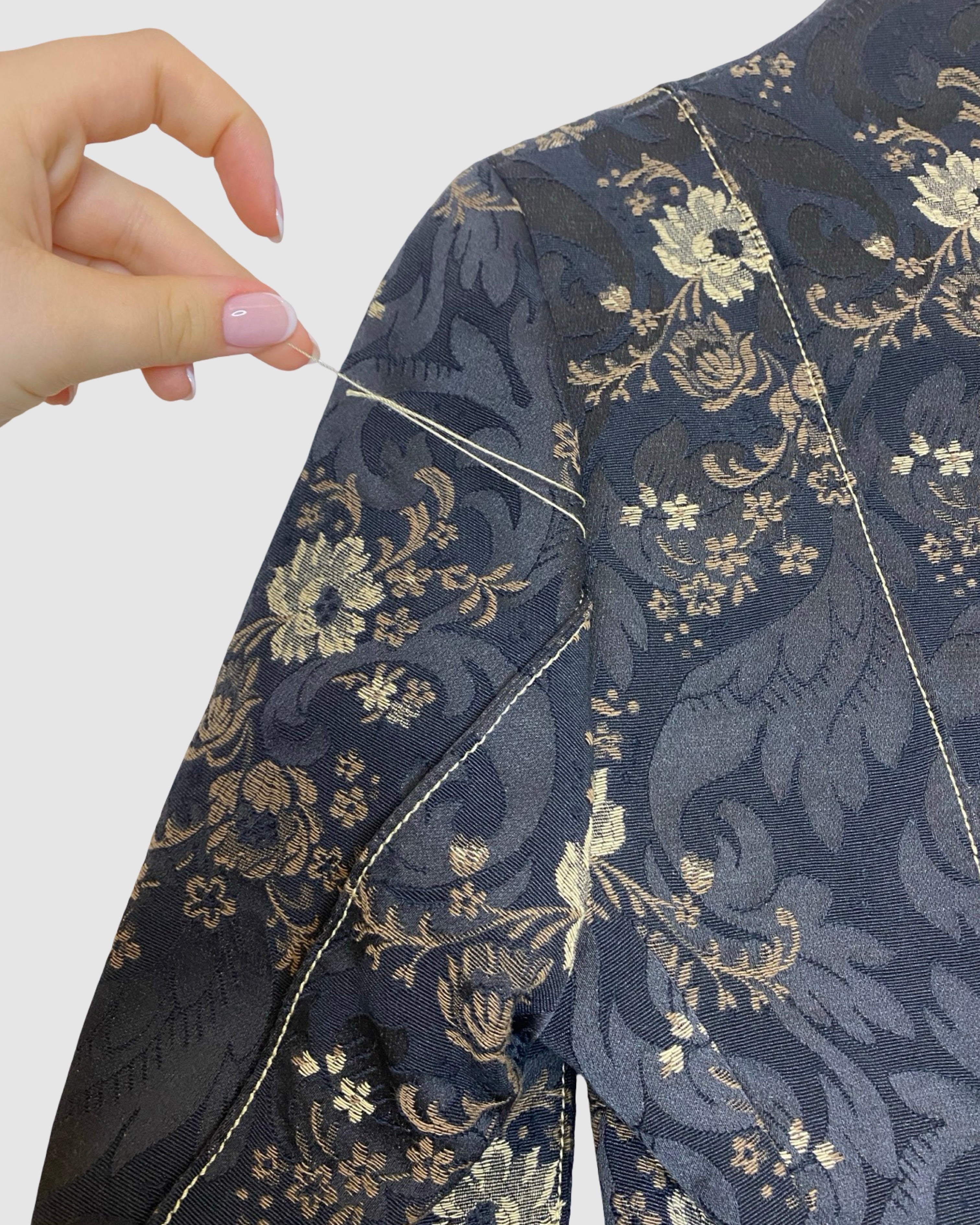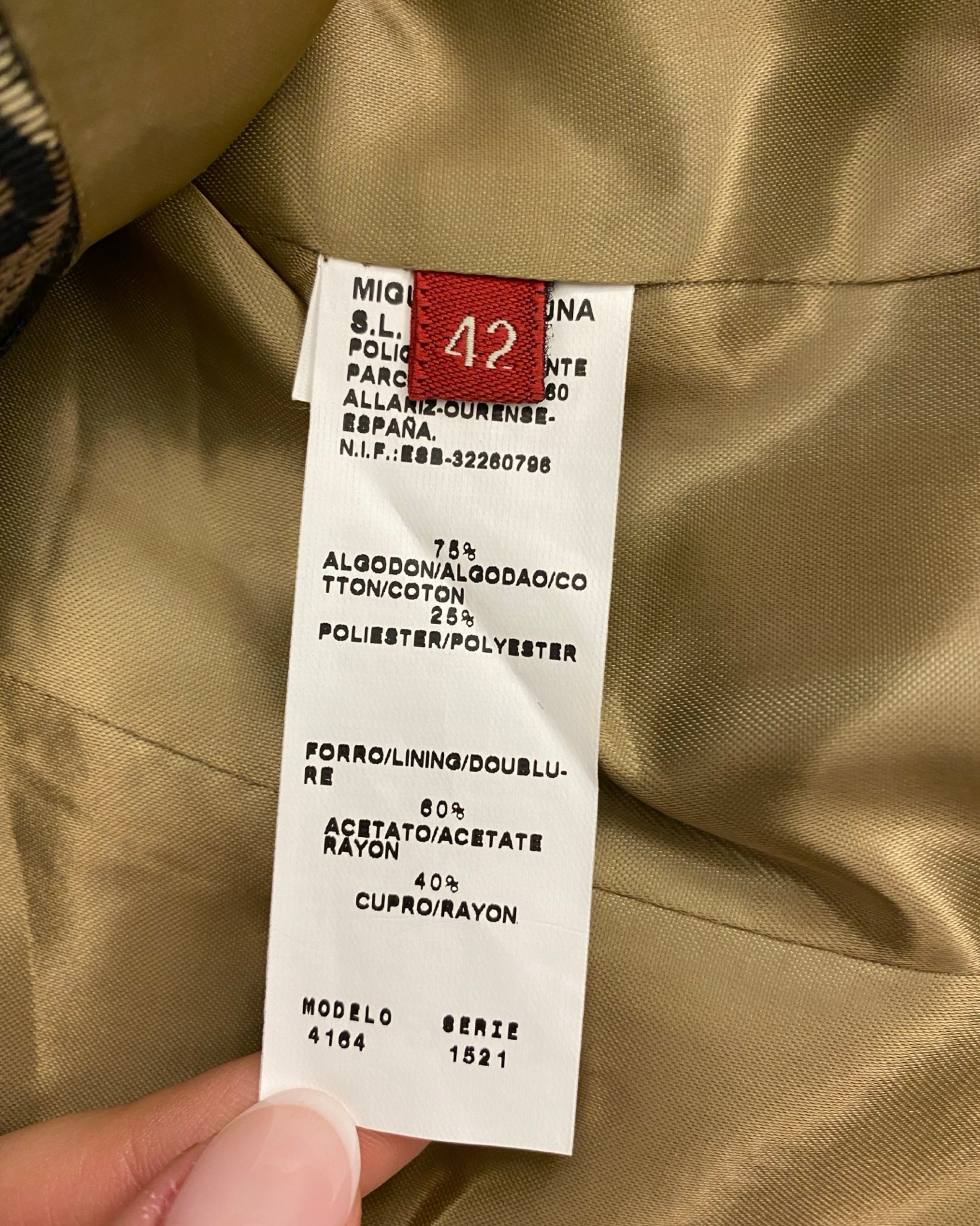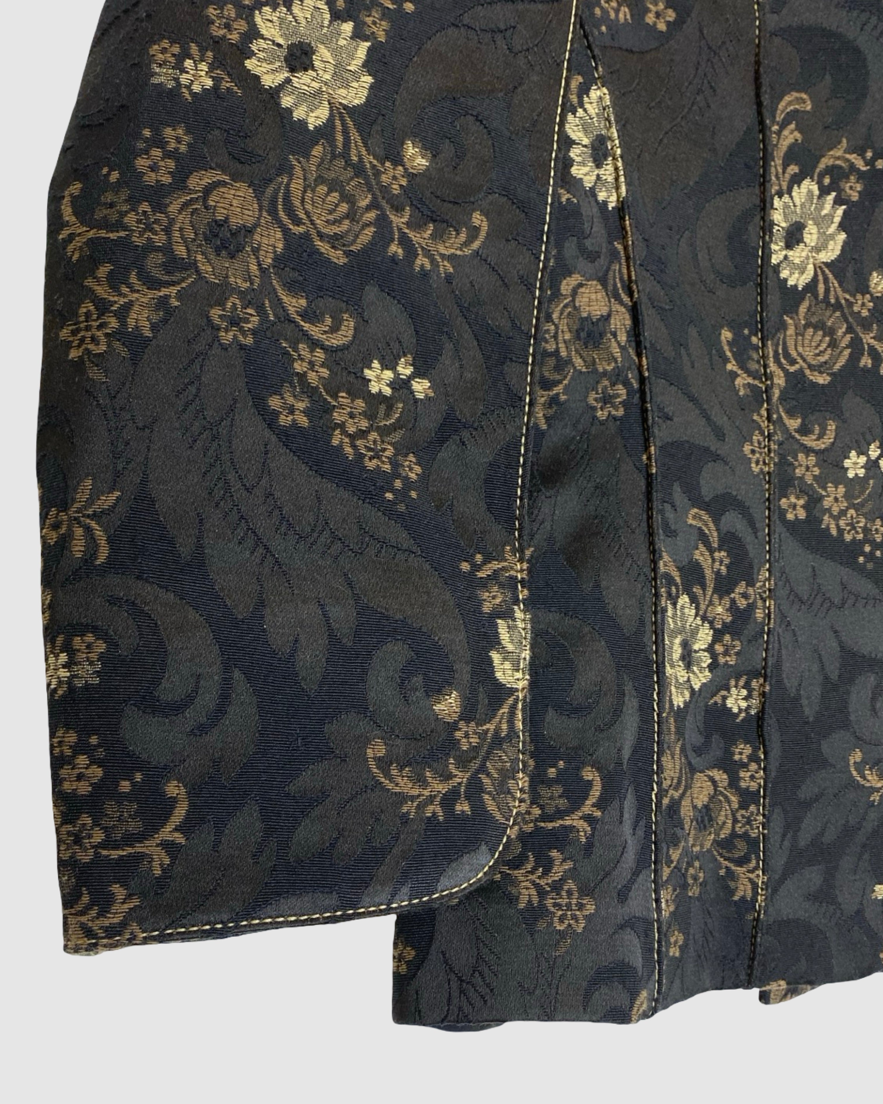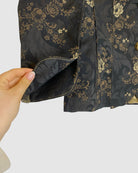 Elegant and eye-catching, this Miguel de Luna black blazer features intricate gold and beige floral detailing for a sophisticated, statement-making look. Crafted from a cotton and polyester blend, it’s perfect for elevating both professional and evening outfits with a touch of designer flair. Size: L.
