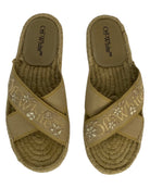 Stay stylish and comfortable this summer with our Off-White sandals. Featuring an embroidered logo and floral applique, these sandals are perfect for any occasion. The crossover strap and almond open toe design add a touch of elegance. Slip into these beautiful logo-embroidered floral slippers and elevate your summer look.