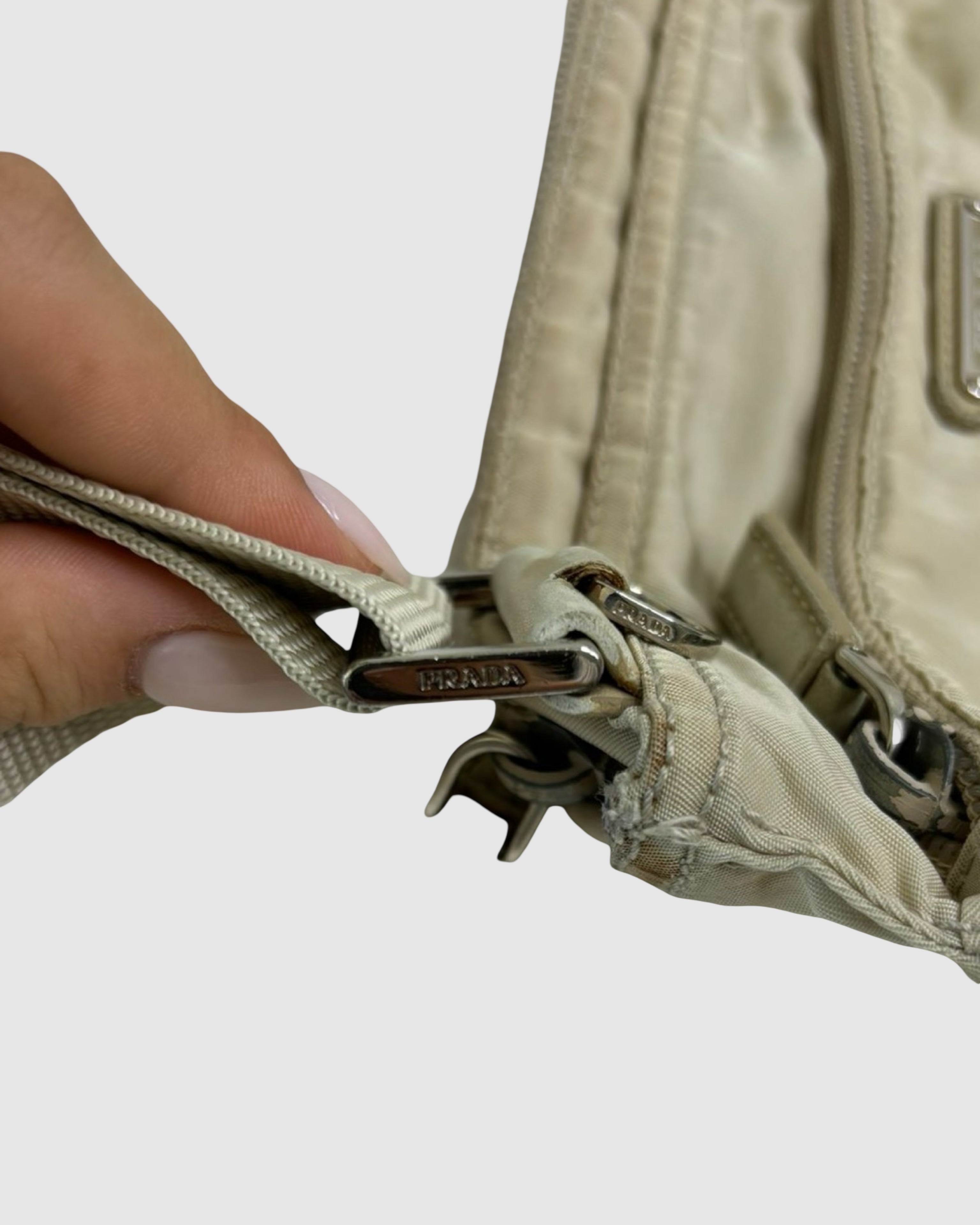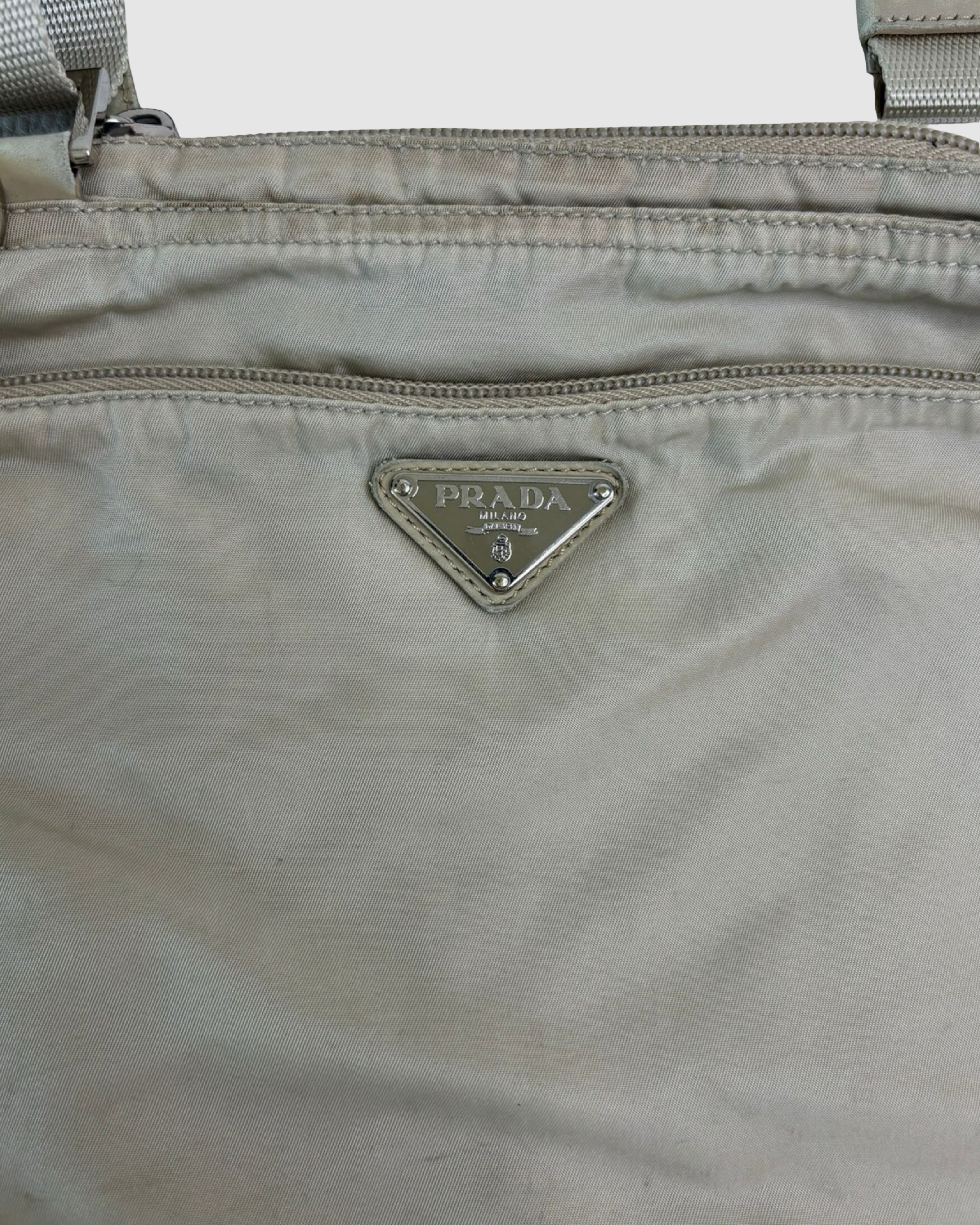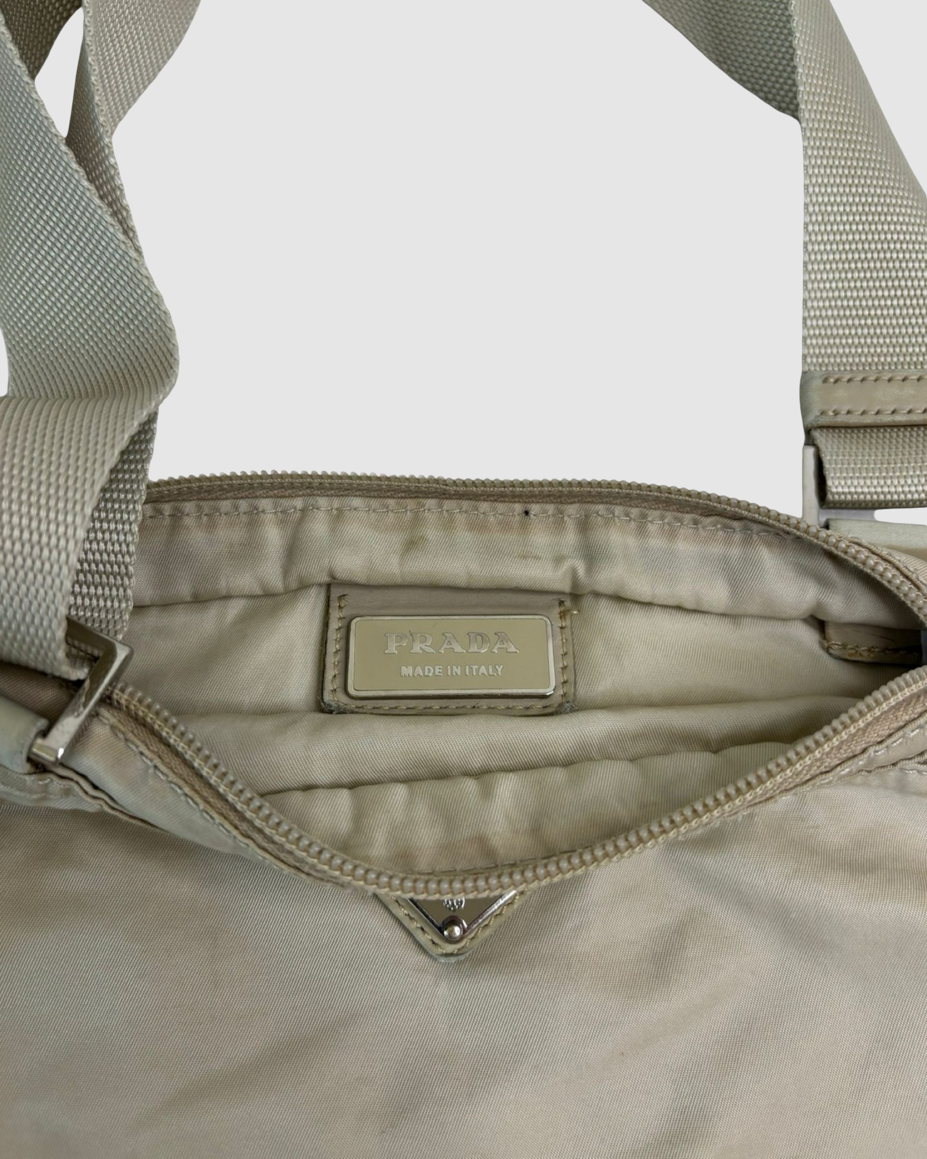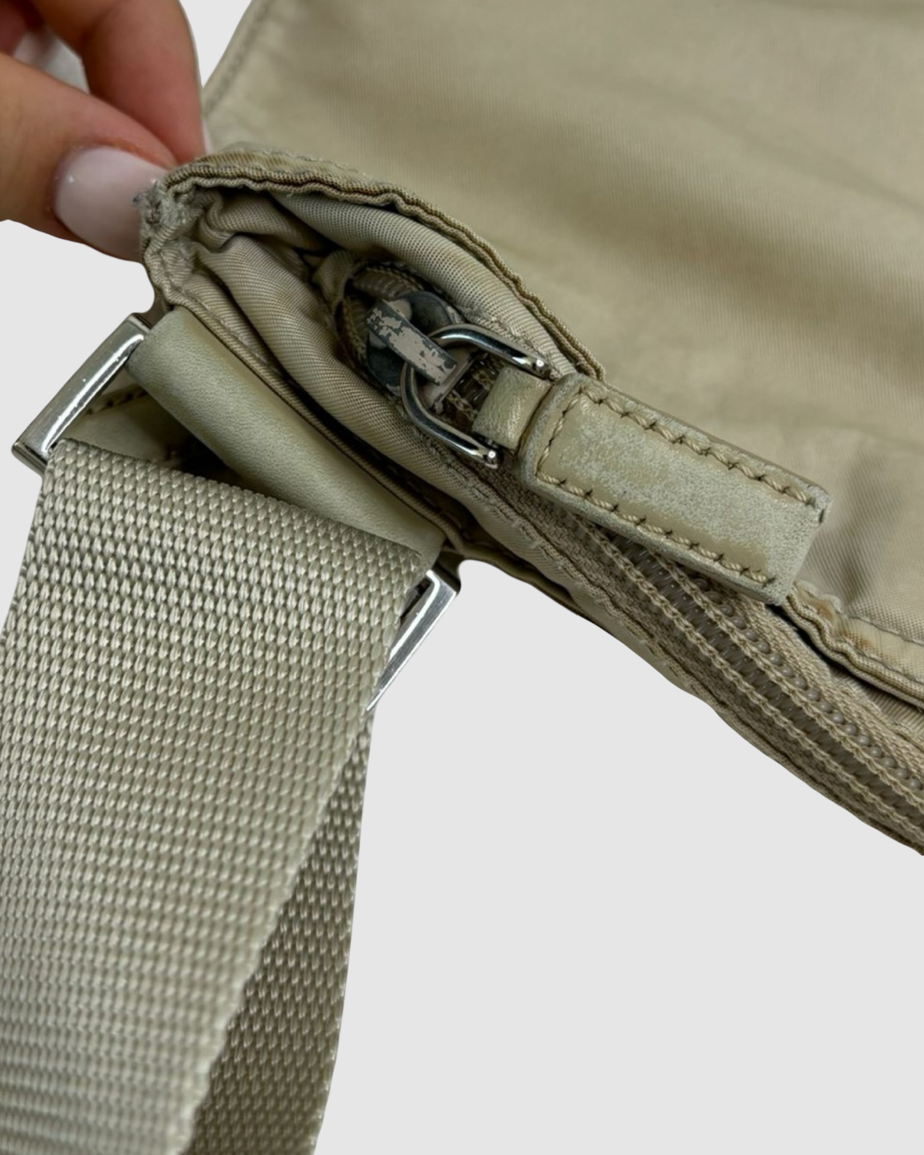 The Prada Tessuto Nylon Flat Messenger Bag in soft beige. Crafted from the brand's signature lightweight nylon fabric, this crossbody style seamlessly blends functionality with refined elegance. The structured flat silhouette and adjustable strap make it an ideal companion for everyday use. Will be sold with original dustbag.
