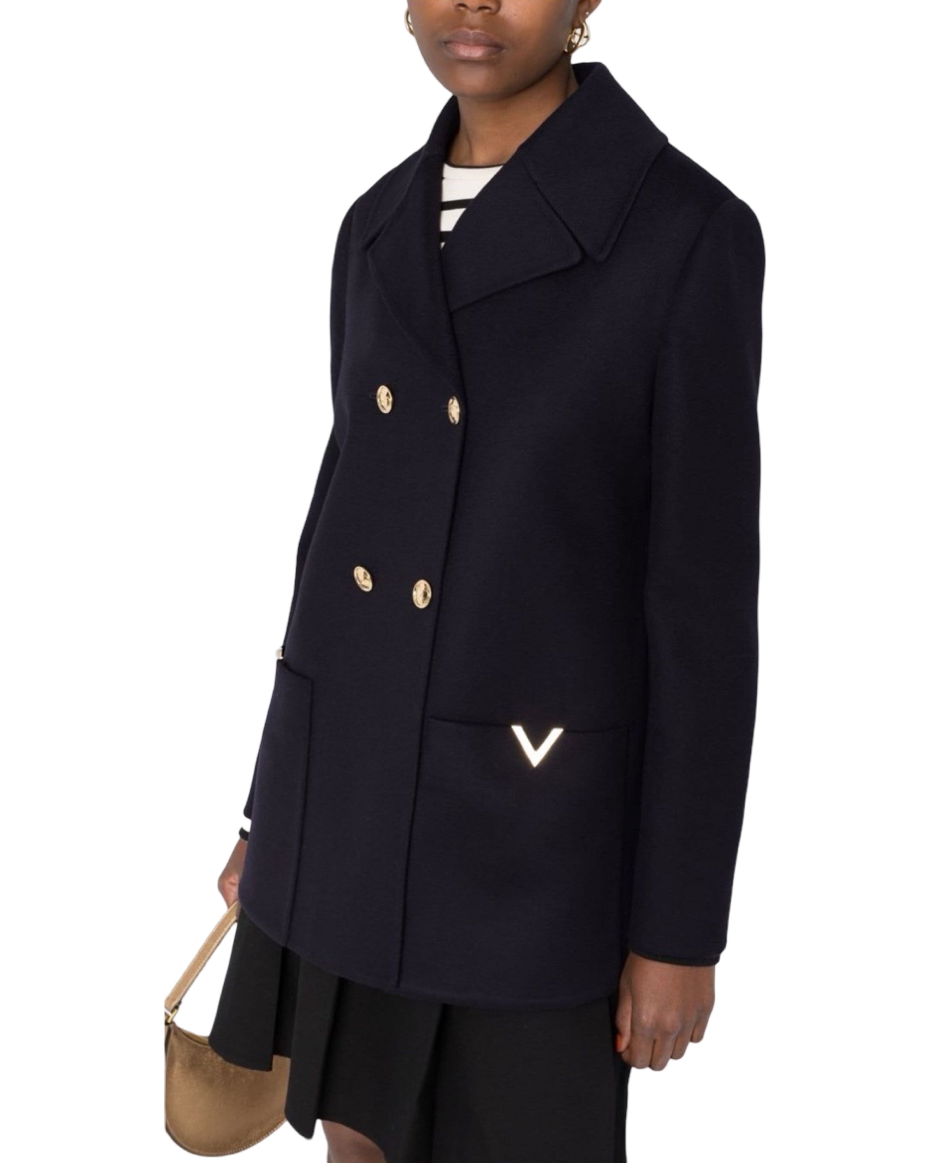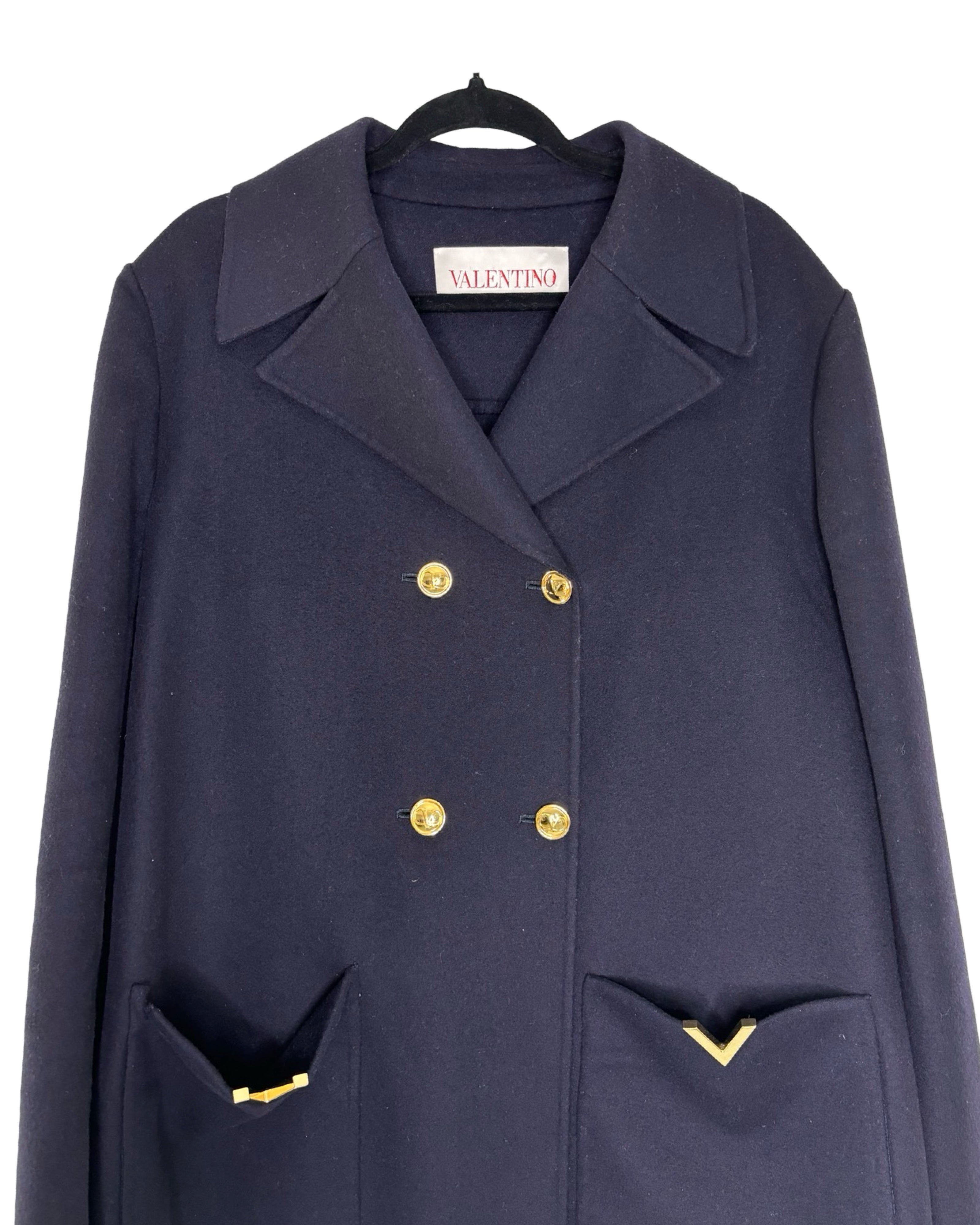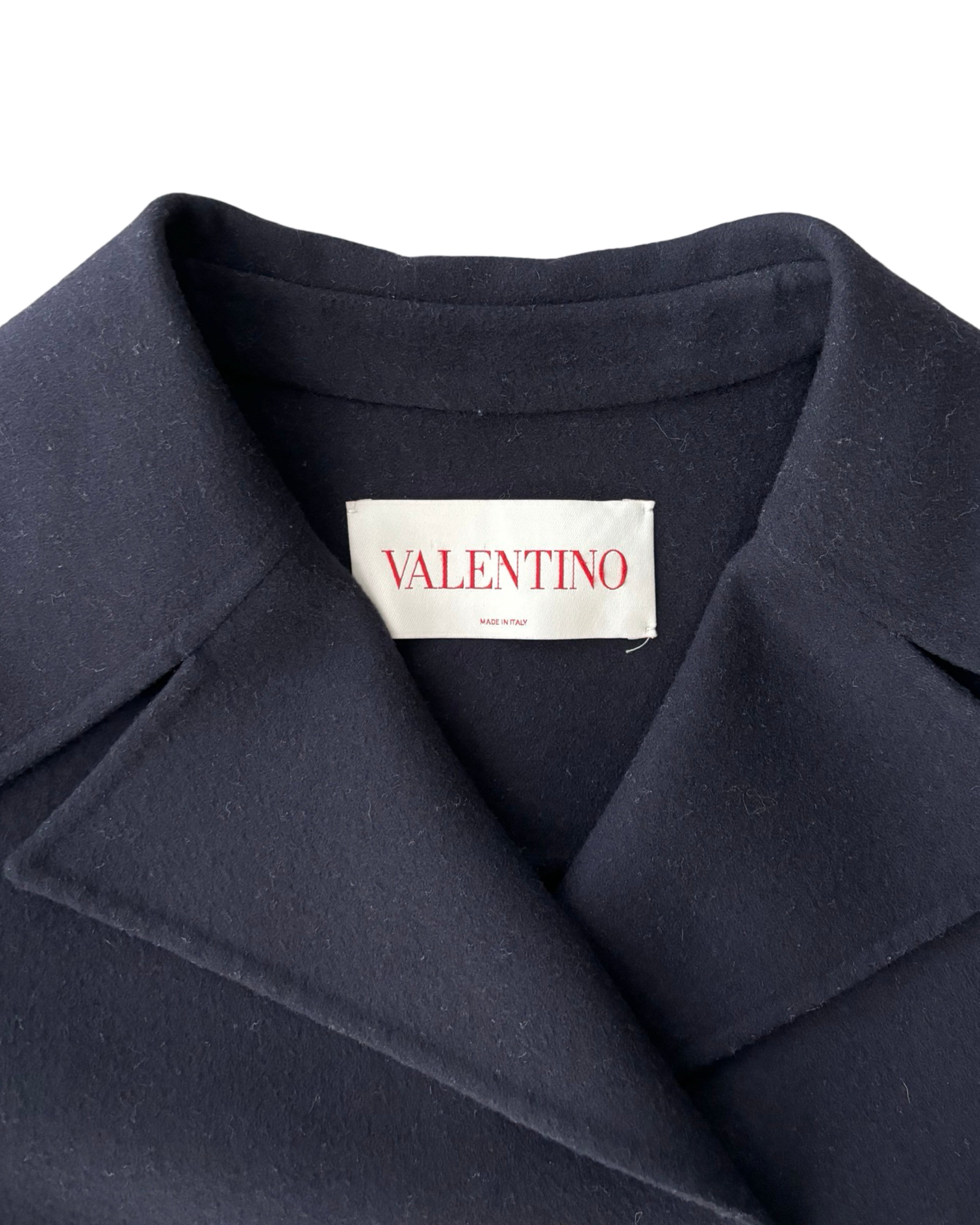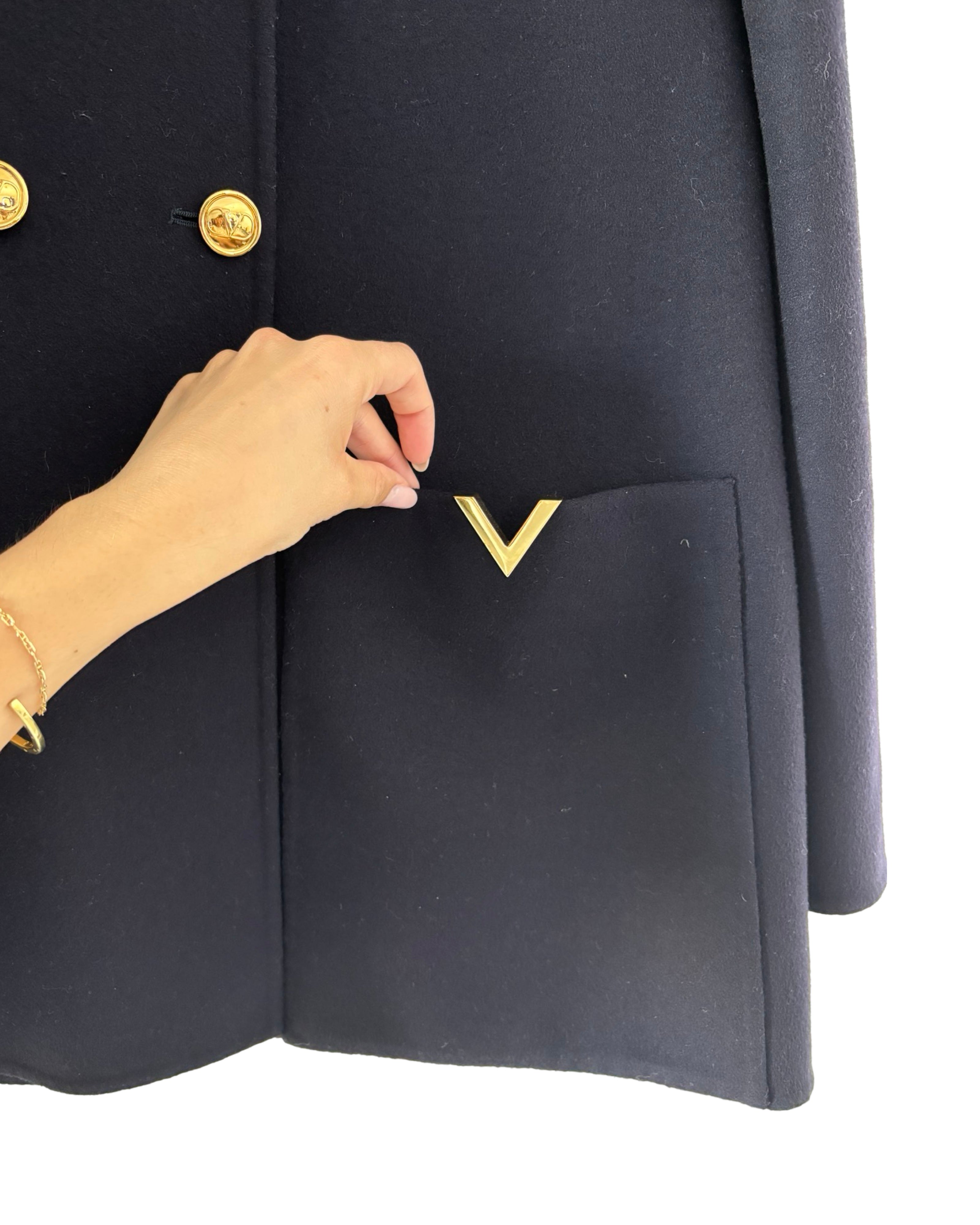 Elevate your winter wardrobe with the VALENTINO GARAVANI peacoat. This elegant VGold double-breasted design features long sleeves, two front patch pockets, and a notched collar. Crafted from a luxurious virgin wool-cashmere blend, it offers both warmth and style. As good as new with minor signs of wear, this L/XL navy blue peacoat is a timeless investment. Material label not present, small cut in the pocket that can easily be sewed. Still available in the stores!