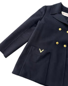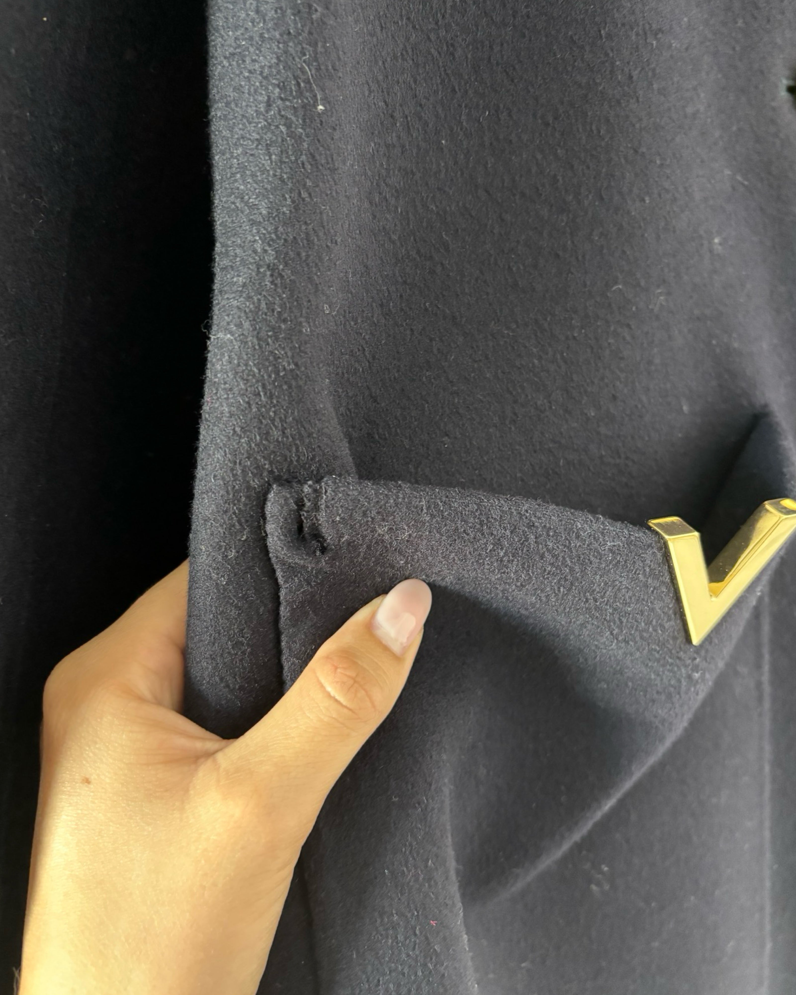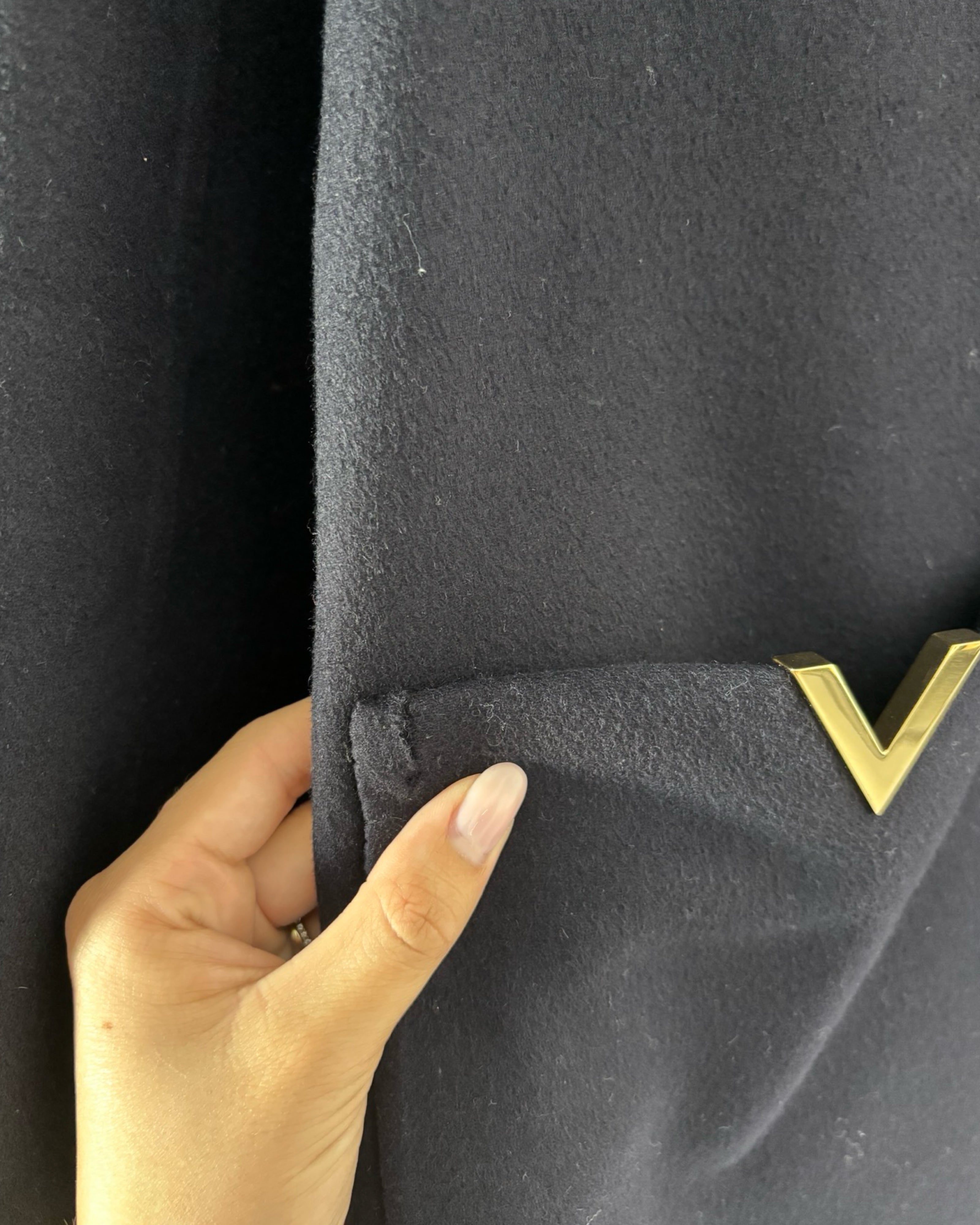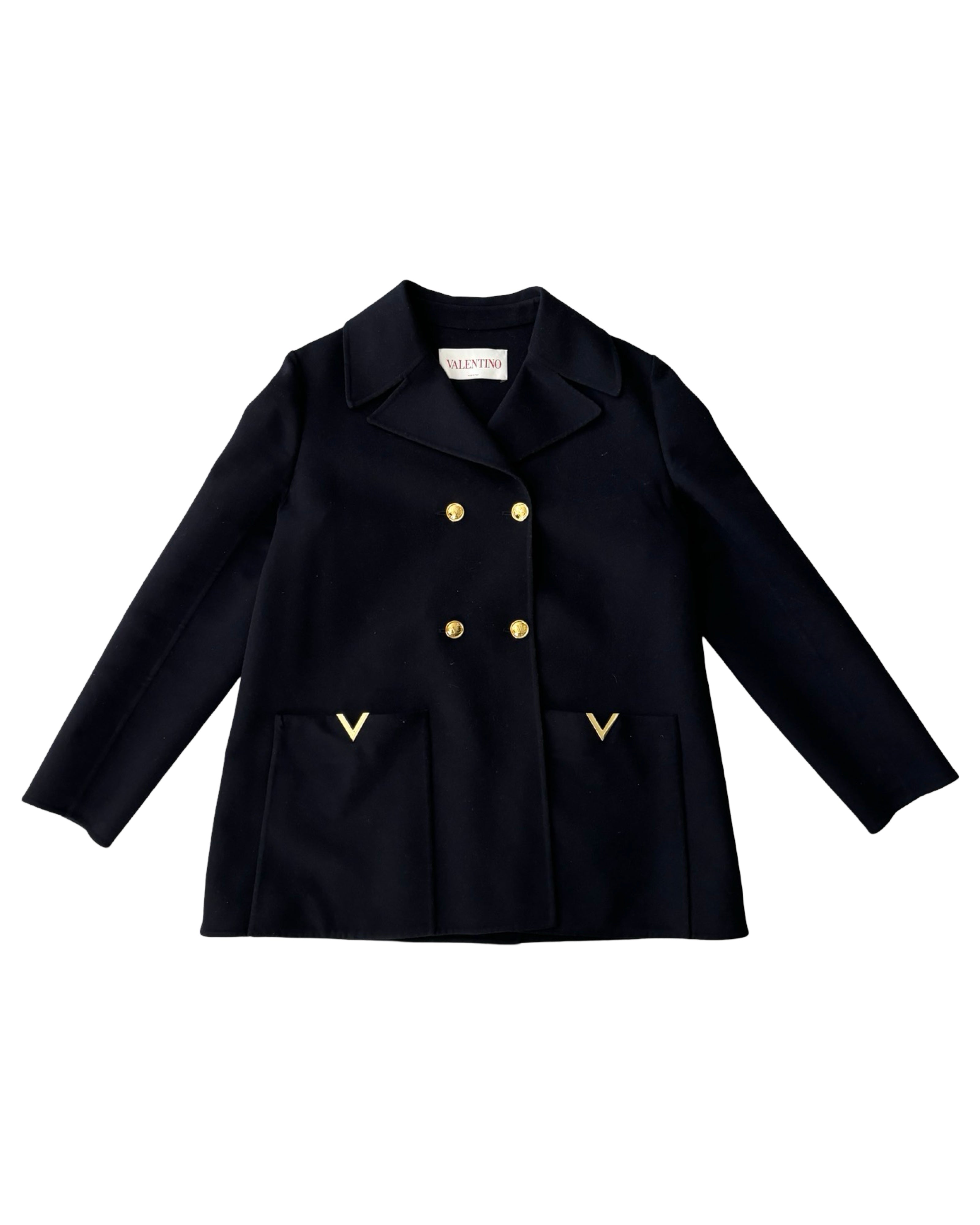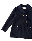 Elevate your winter wardrobe with the VALENTINO GARAVANI peacoat. This elegant VGold double-breasted design features long sleeves, two front patch pockets, and a notched collar. Crafted from a luxurious virgin wool-cashmere blend, it offers both warmth and style. As good as new with minor signs of wear, this L/XL navy blue peacoat is a timeless investment. Material label not present, small cut in the pocket that can easily be sewed. Still available in the stores!