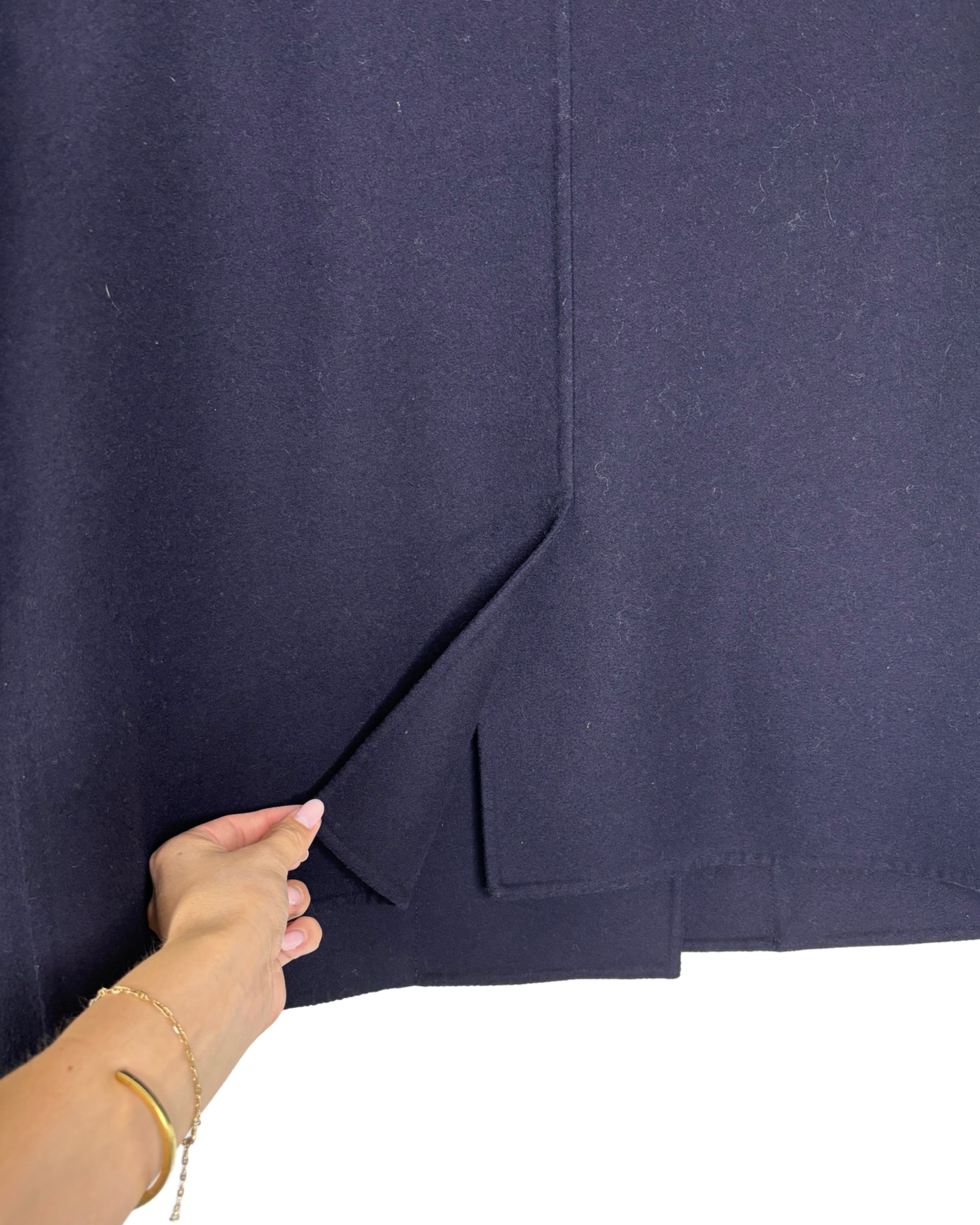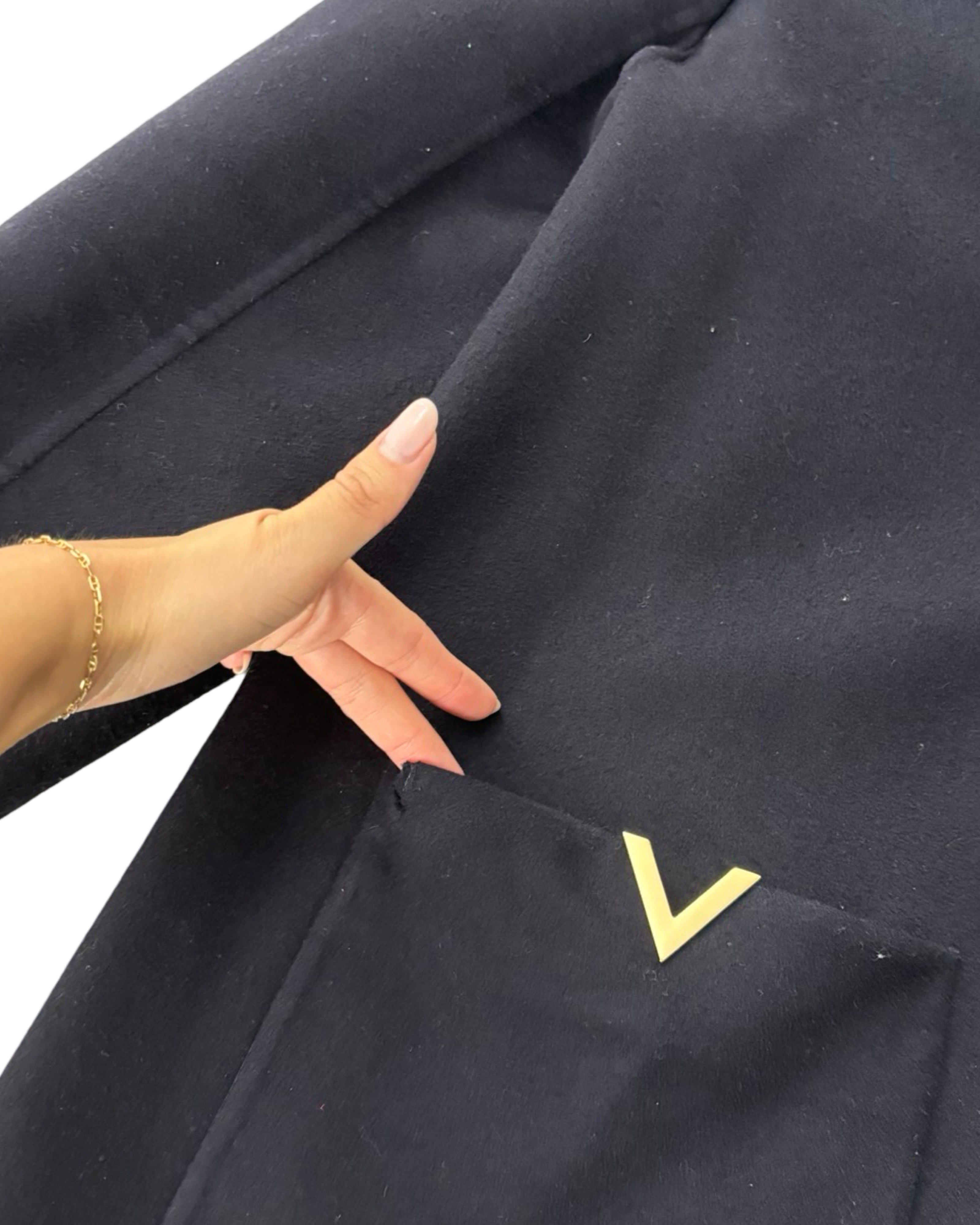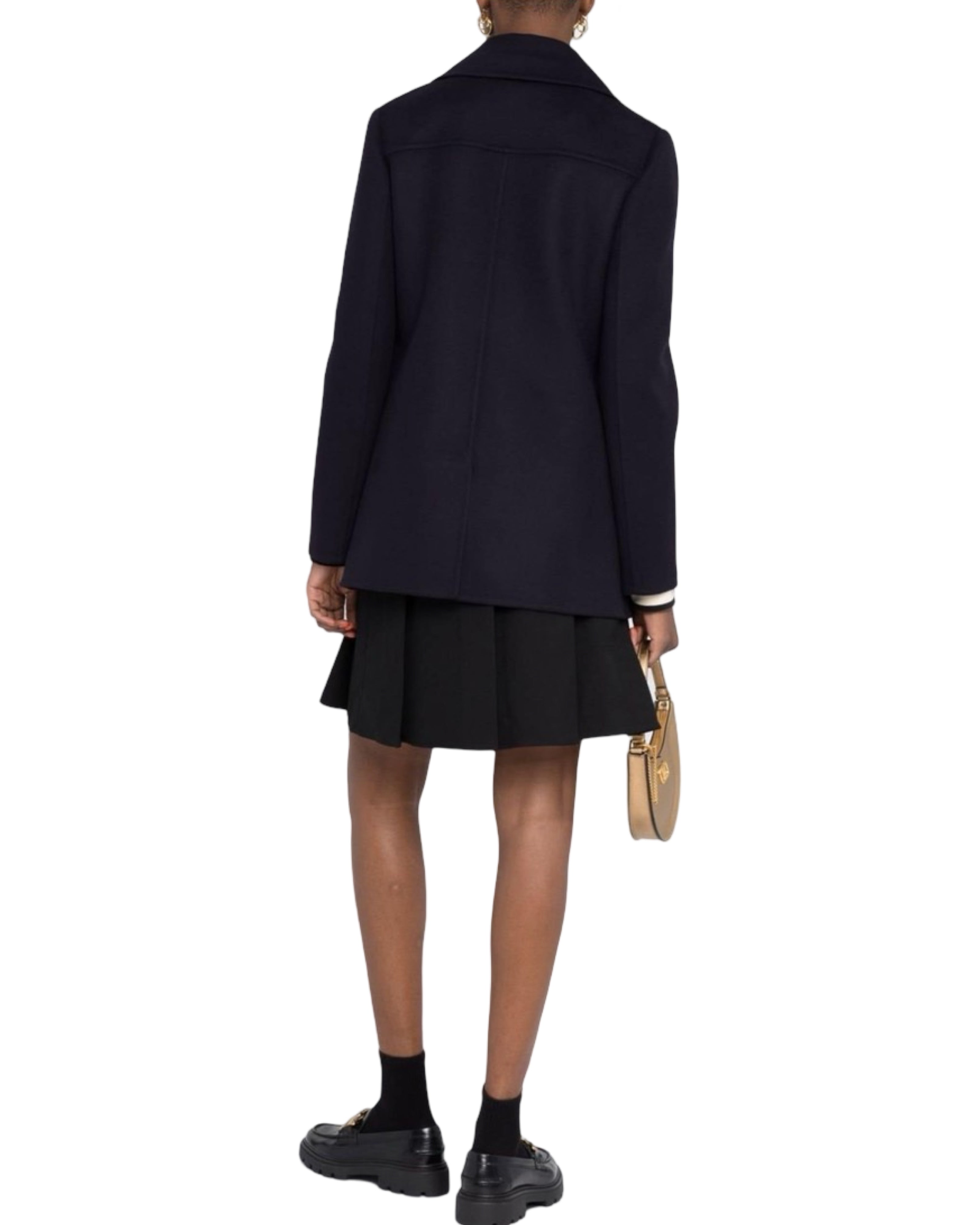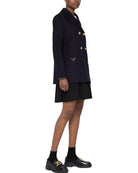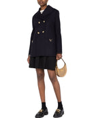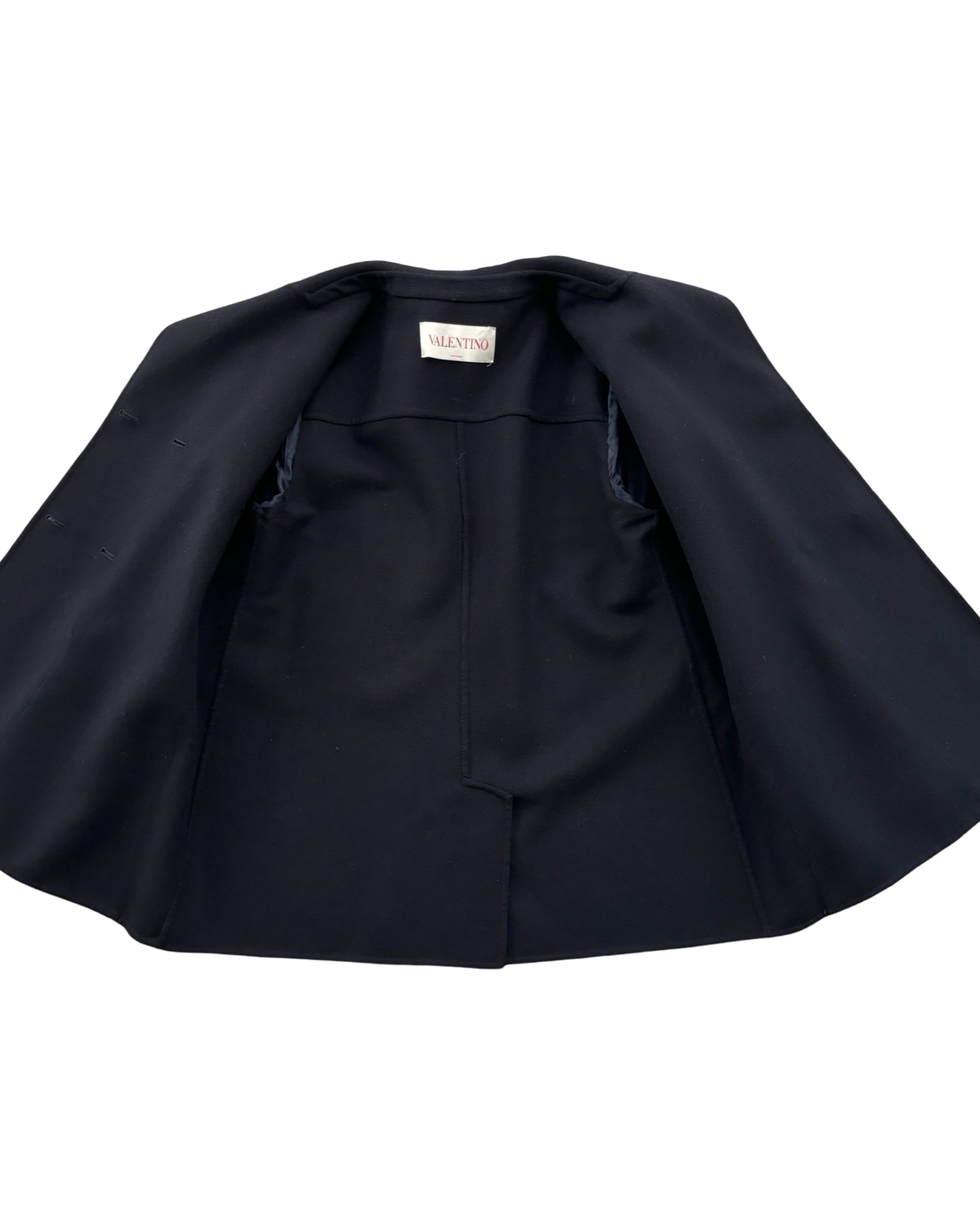 Elevate your winter wardrobe with the VALENTINO GARAVANI peacoat. This elegant VGold double-breasted design features long sleeves, two front patch pockets, and a notched collar. Crafted from a luxurious virgin wool-cashmere blend, it offers both warmth and style. As good as new with minor signs of wear, this L/XL navy blue peacoat is a timeless investment. Material label not present, small cut in the pocket that can easily be sewed. Still available in the stores!