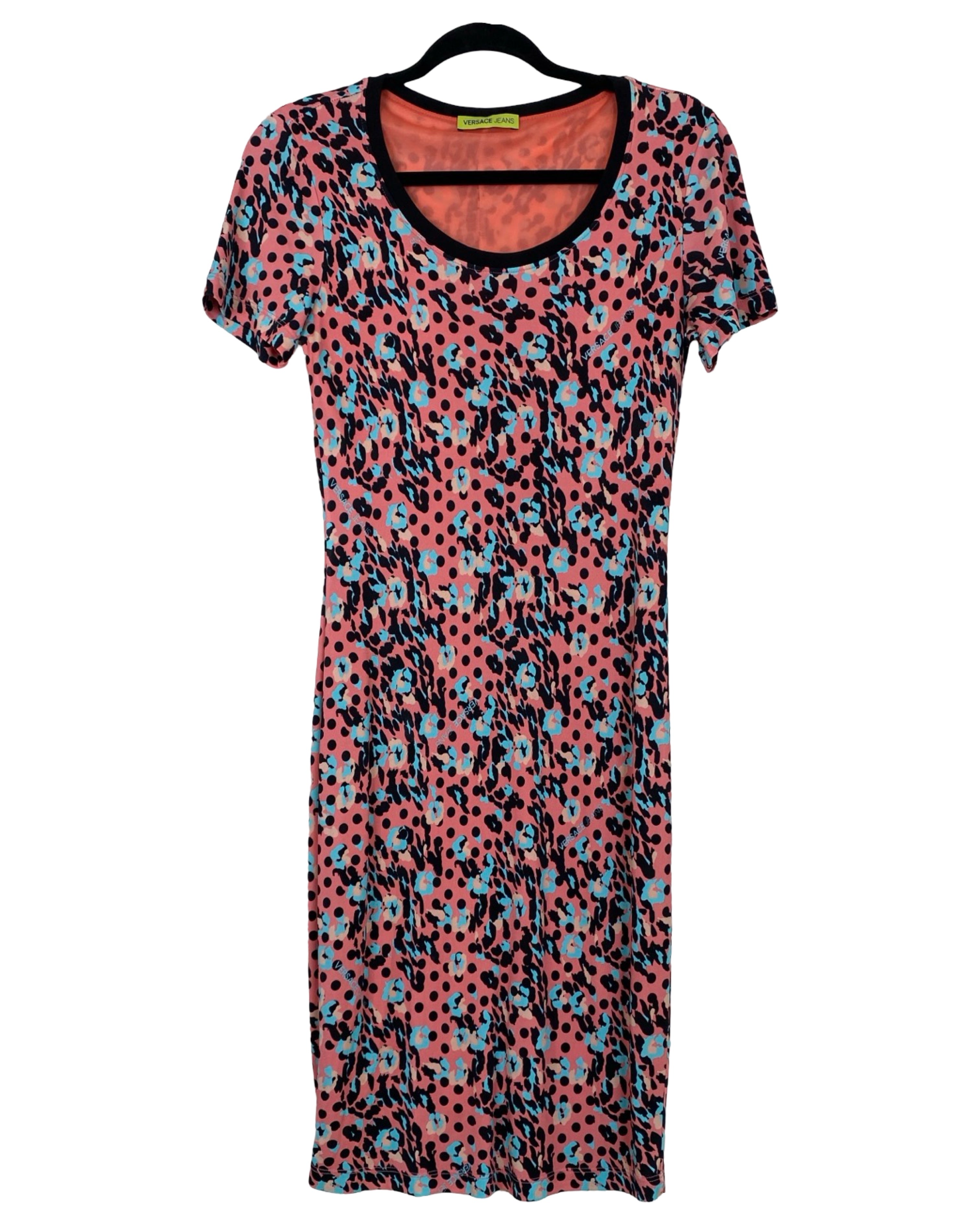 This Versace Jeans dress features a striking leopard print with the iconic Versace logo. Made with a blend of viscose, polyamide, and polyester, this dress offers both style and comfort. With a crewneck and short sleeves, it's perfect for casual occasion.